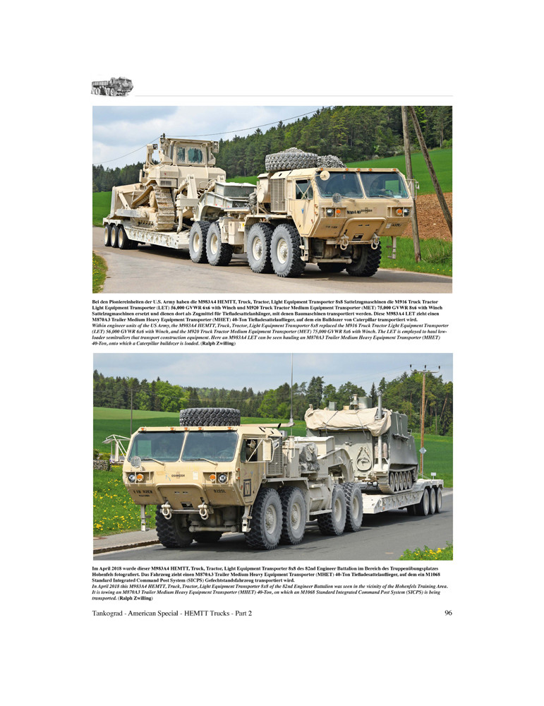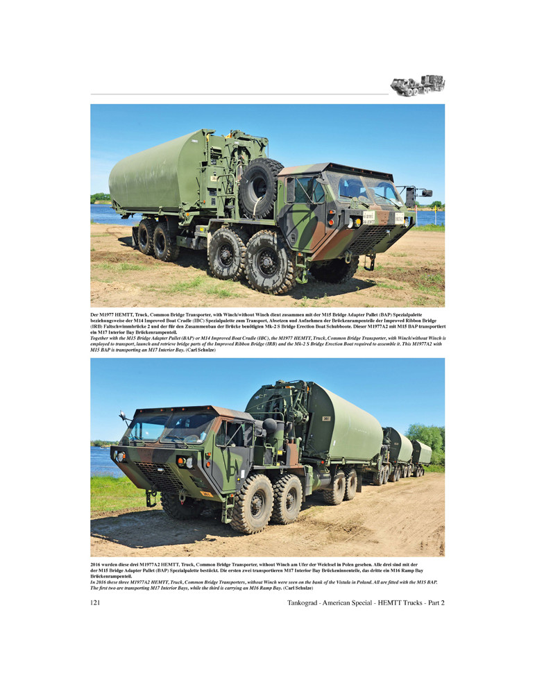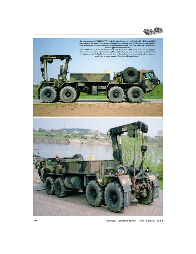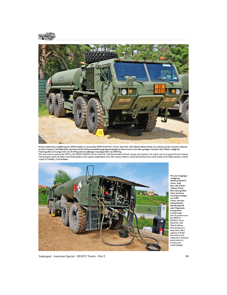Cette publication est l'ouvrage standard amélioré sur le HEMTT. Il couvre les types de base M977, M978, M983, M984, M985, M1120 et M1977 ainsi que leurs variantes jusqu'aux versions A4. S'étendant sur deux volumes de 128 pages et avec pas moins de 265 photographies en couleurs, dont beaucoup jusqu'alors inédites, il remplace l'édition originale longue épuisée Tankograd American Special 3003.