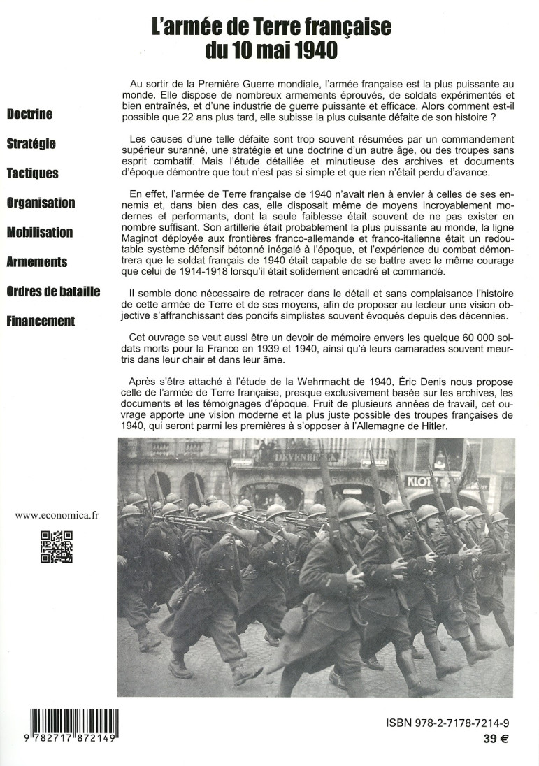 Cet ouvrage se veut aussi être un devoir de mémoire envers les quelque 60 000 soldats morts pour la France en 1939 et 1940, ainsi qu'à leurs camarades souvent meurtris dans leur chair et dans leur âme. Après s'être attaché à l'étude de la Wehrmacht de 1940, Eric Denis nous propose celle de l'armée de Terre française, presque exclusivement basée sur les archives, les documents et les témoignages d'époque. Fruit de plusieurs années de travail, cet ouvrage apporte une vision moderne et la plus juste possible des troupes françaises de 1940, qui seront parmi les premières à s'opposer à l'Allemagne de Hitler.