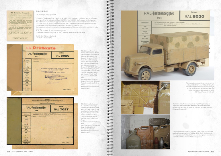 • Système RAL et cartes de couleurs. Règlements de l'OKH • Avant-guerre • Première guerre • Russie • Afrique • Le système trois tons • Le début de la fin • La fin • Comparaison des couleurs Dunkelgelb et Rotbraun • Pièces et analyses couleur originales • Photographies couleur de la Seconde Guerre mondiale •