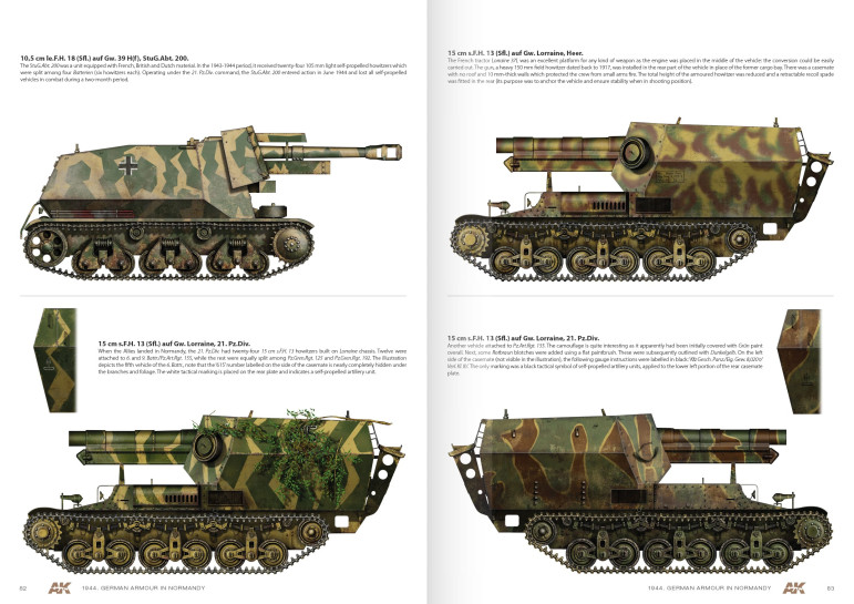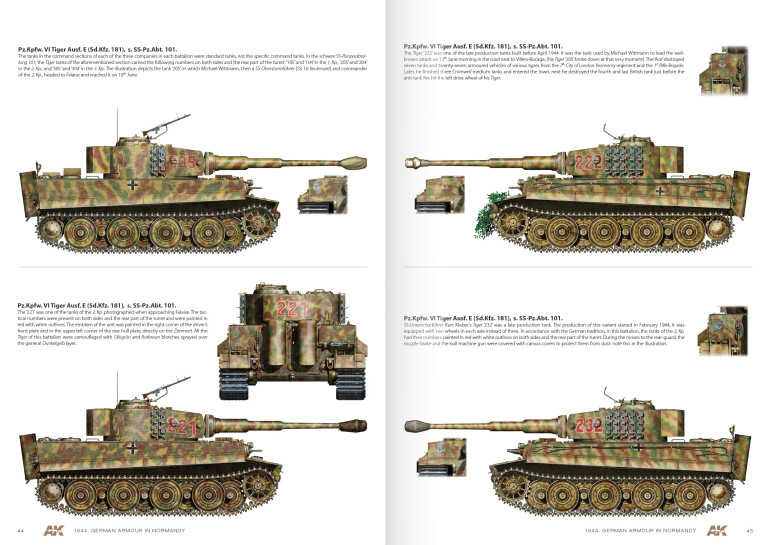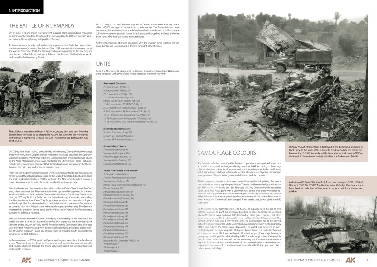 Découvrez la pléthore de différents motifs de camouflage représentés sur 190 profils de couleurs , et lisez les légendes informatives qui donnent de plus amples explications sur les couleurs et les marques utilisées par diverses unités qui ont combattu avec les Alliés pendant les mois d'été 1944, ainsi que leur organisation et leur équipement.