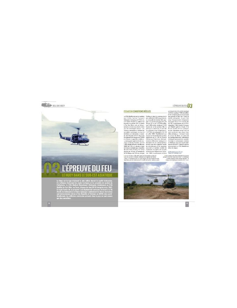 Cet hélicoptère, d’abord destiné aux évacuations médicales, s’avère en fait si robuste que Washington décide de l’adapter en plusieurs versions, pendant que l’USMC et l’US Air Force décident à leur tour de commander des exemplaires de l’appareil fabriqué par Bell. Mais c’est pendant la guerre du Viêtnam que le « Huey » connaîtra son baptême du feu… et entrera dans la légende.