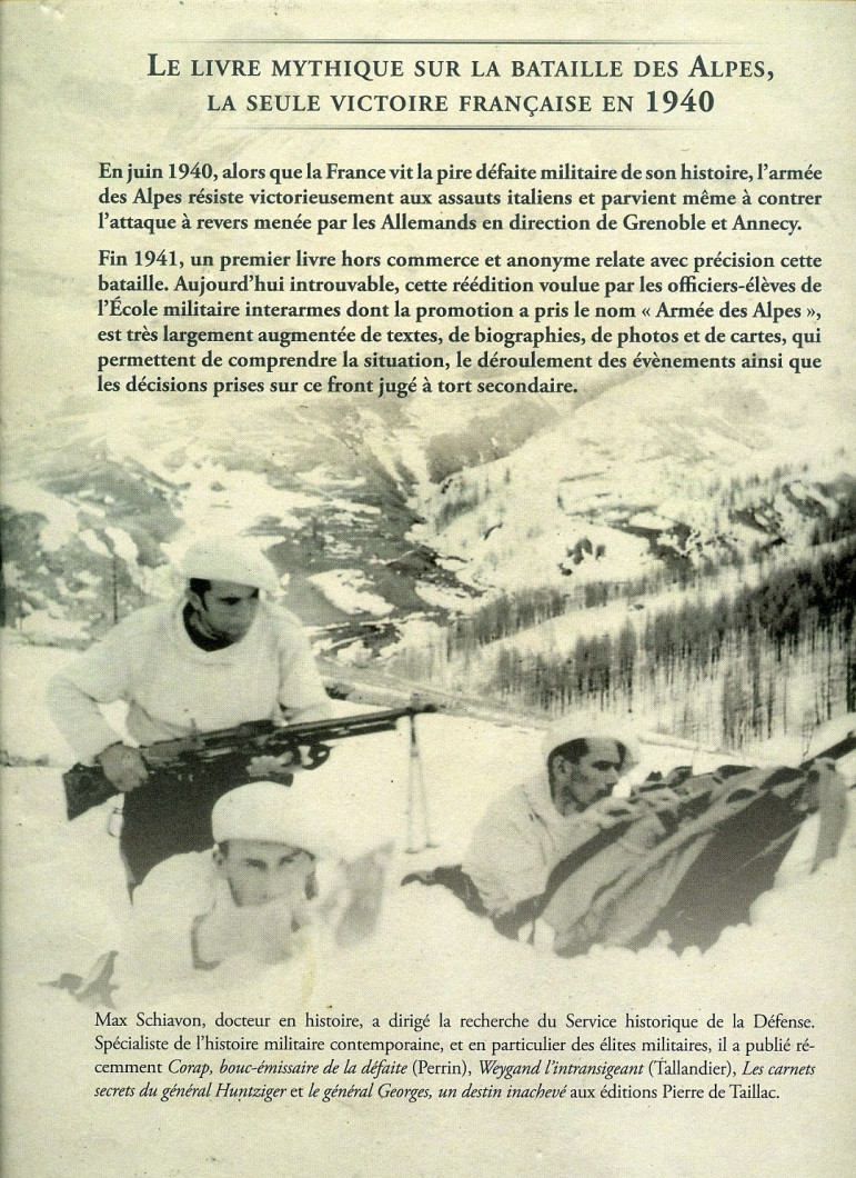 Fin 1941, un premier livre hors commerce et anonyme relate avec précision cette bataille. Aujourd’hui introuvable, cette réédition voulue par les officiers-élèves de l’École militaire interarmes dont la promotion a pris le nom de « Bataille des Alpes », est très largement augmentée de textes, de biographies, de photos et de cartes, qui permettent de comprendre la situation, le déroulement des évènements ainsi que les décisions prises sur ce front jugé à tort secondaire.