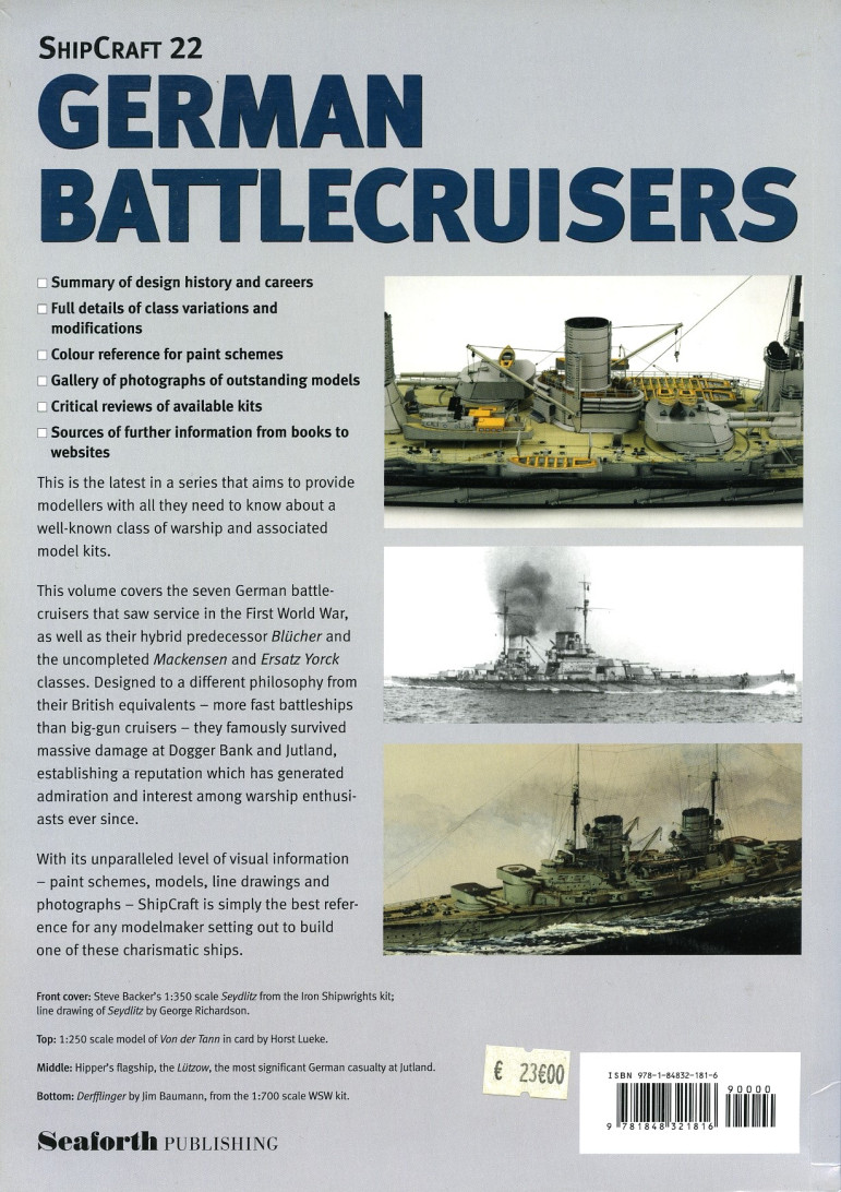 Ce volume est consacré au célèbre navires du premier groupe de reconnaissance de l'amiral Hipper. Plus lents mais plus robustes que leurs équivalents britanniques, les croiseurs de bataille allemands avaient la réputation d'absorber les punitions, et bien que Lützow ait été coulé au Jutland, Seydlitz et le reste du groupe de reconnaissance ont survécu à de lourds dommages. Ce livre se concentre sur les sept navires achevés, mais la couverture s'étend au « proto-cruiser de bataille » Blücher et aux navires construits ou conçus à la fin de la guerre.