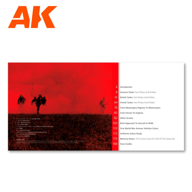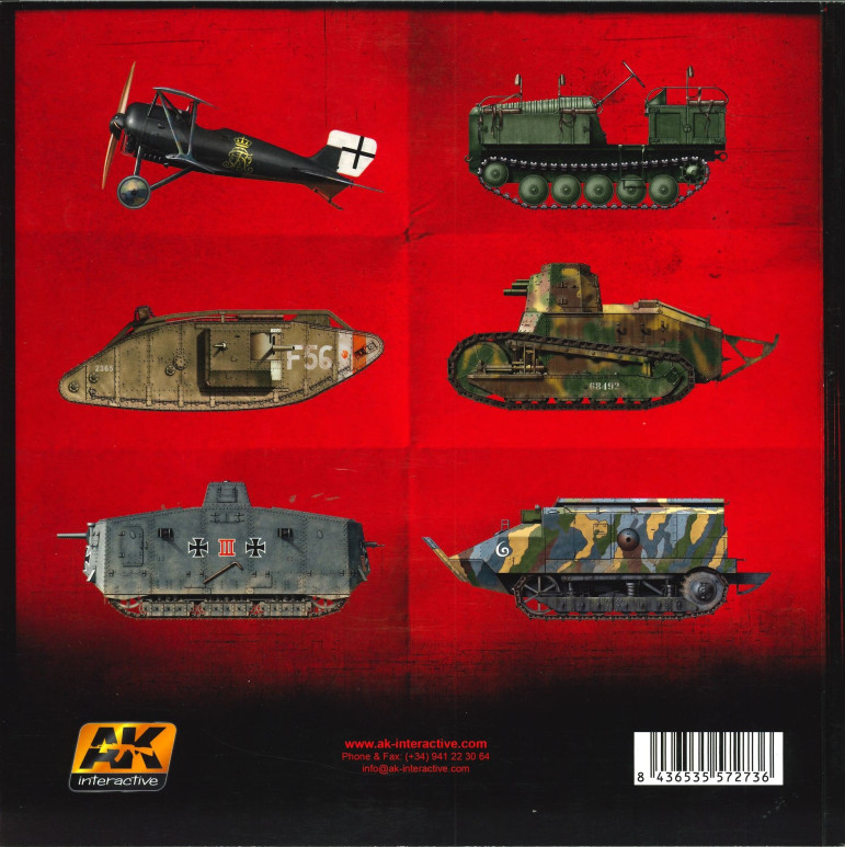 Une brève référence à l'évolution de l'aviation militaire pendant la Grande Guerre est également incluse, avec des profils de couleurs des avions de combat les plus importants utilisés par tous les prétendants. En prime, le livre offre une exclusivité mondiale ; une fantastique collection de photographies noir et blanc grand format, jamais publiées auparavant ; assurément, une collection de photos aussi étonnante incitera les modélistes à créer des dioramas et des vignettes précis de la Première Guerre mondiale, la première guerre mécanisée.