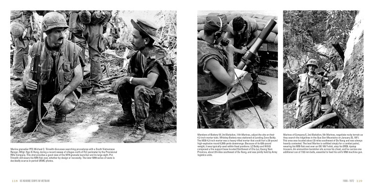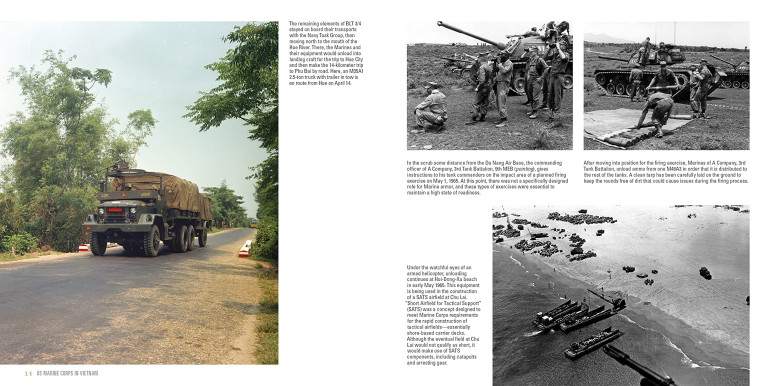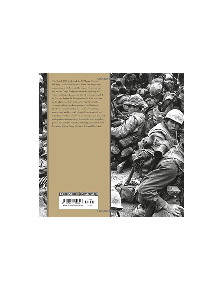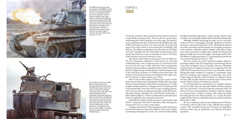 Les armes légères, les mortiers et l'artillerie, les chars, les véhicules amphibies, blindés et à peau douce, les hélicoptères, les uniformes et l'équipement personnel et spécialisé sont présentés dans des photos de superbe qualité et des légendes détaillées, y compris des photos de batailles légendaires du Corps des Marines comme Hue et Khe Sanh.
