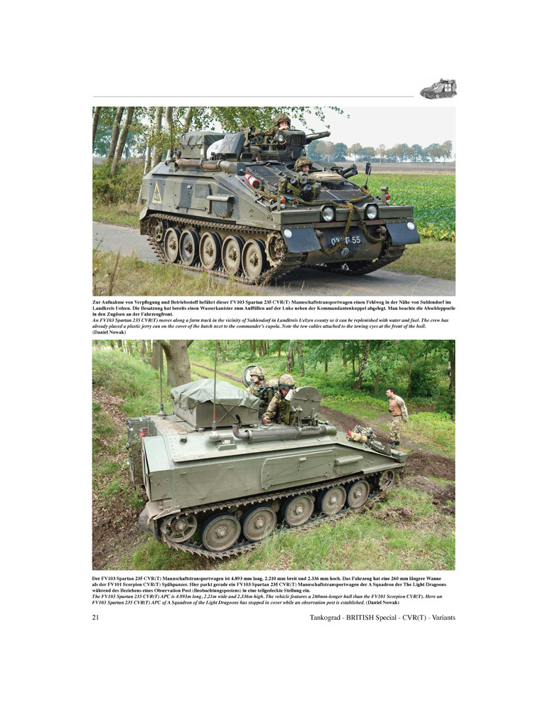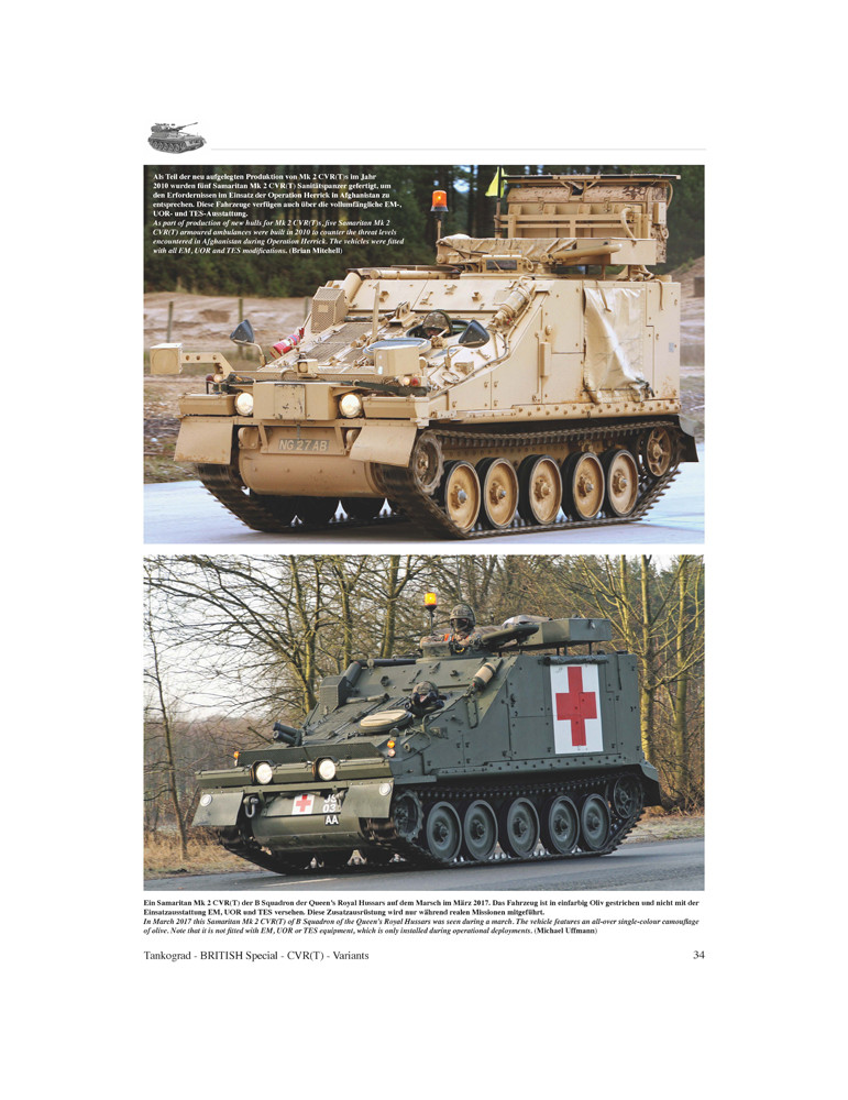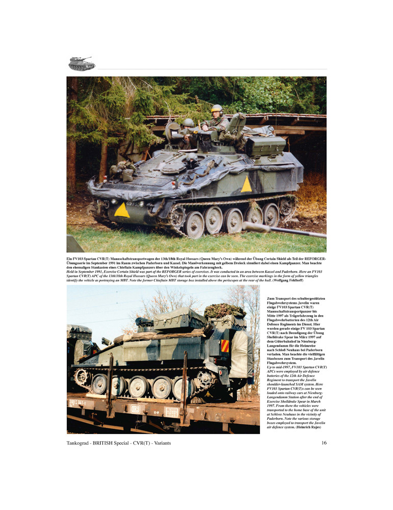 Cette publication en double volume, richement illustrée de pas moins de 260 photos couleur et noir et blanc ainsi que des graphiques sur un total de 128 pages, décrit l'historique du développement et la technologie, mais avant tout l'utilisation des nombreux véhicules de la famille CVR(T) en exercice. Le volume 1 (spécial 9033) couvre les véhicules de reconnaissance Scorpion, Scimitar et Sabre tandis que le volume 2 (spécial 9034) traite des variantes telles que le Striker, le Spartan, le Samaritan, le Sultan, le Samson, le Stormer et le Shielder.