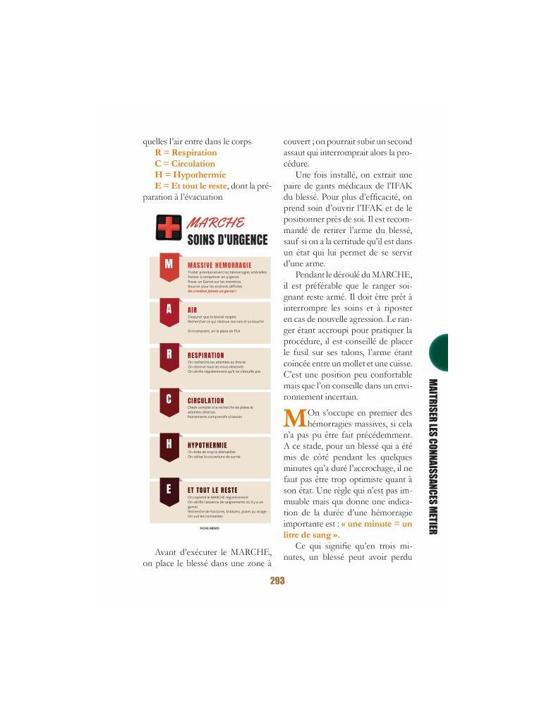 Il aborde également les soins de base à prodiguer lorsque l’on est loin de tout et suggère des équipements simples et adaptés. Des procédures opérationnelles viennent compléter l’ouvrage en détaillant les techniques de communication utilisées sur le terrain, les progressions en patrouille, les déplacements et les méthodes d’interception des criminels.