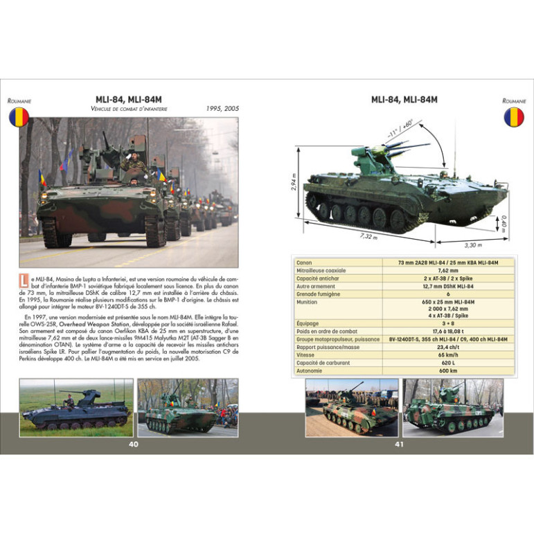 Le présent ouvrage regroupe tous les véhicules de combat d’infanterie modernes du monde et leurs nombreuses modifications et modernisations. Riche de plus de 300 photos, il révèle l’historique des blindés avec les dates précises des mises en service et présente les capacités et les caractéristiques techniques pour chaque modèle.