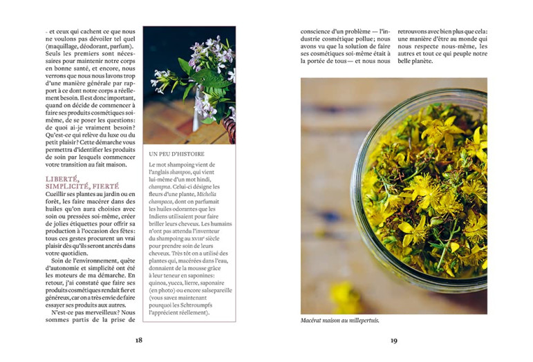 Que faire du calendula qui pousse si bien dans le jardin ? Quelle huile locale utiliser pour nourrir ses cheveux, et comment la fabriquer ? Aurélie Valtat partage ses recettes faciles et efficaces d'huiles, hydrolats, savons, déodorants, dentifrices et shampoings naturels pour une salle de bain minimaliste, le tout avec des produits locaux, accessibles et sains. Ce guide vous propose toutes les bases, des conseils de culture des végétaux à la réalisation de recettes adaptées à chaque type de peau.