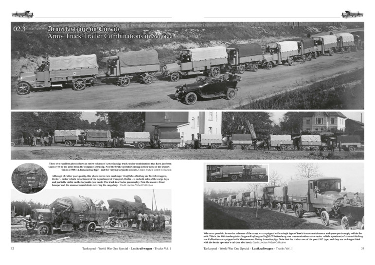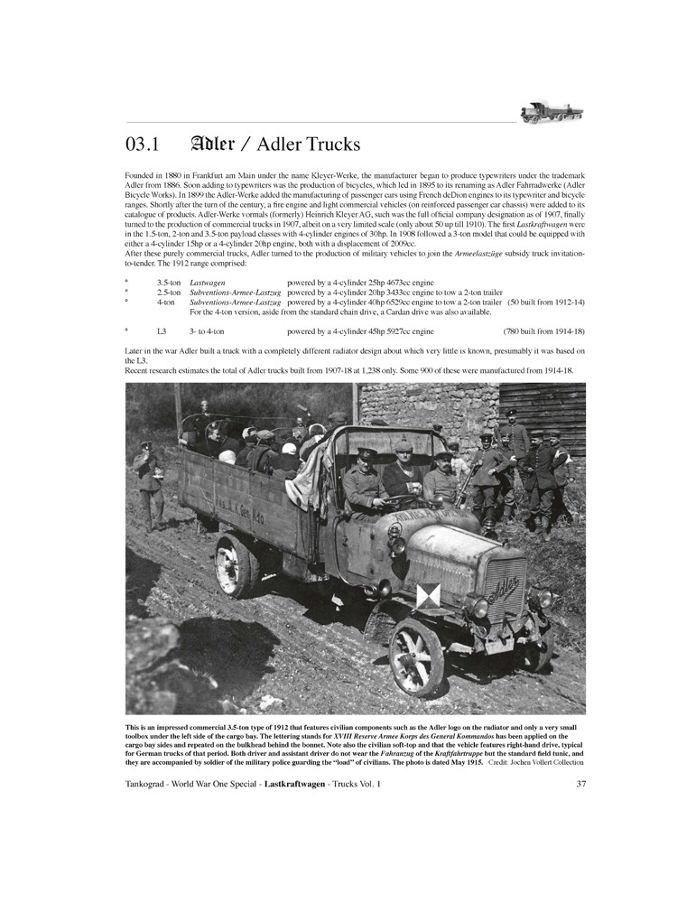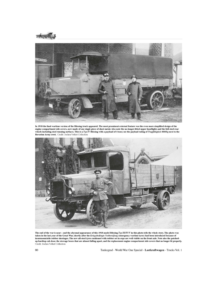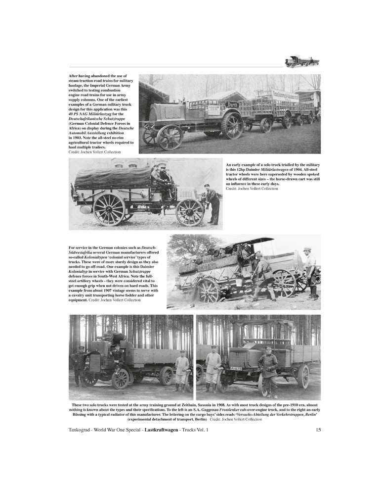Cette publication raconte, pour la première fois, l'histoire de la façon dont le Lastkraftwagen (camion cargo) est devenu l'épine dorsale des opérations de ravitaillement militaire allemandes pendant la Première Guerre mondiale. La création et l'organisation de la Kraftfahrtruppe (Army Motor Transport Corps) sont largement décrites dans le texte, suivies de chapitres richement illustrés sur les camions des différents fabricants. Ceux-ci incluent des acteurs majeurs tels que Benz, Daimler et Opel ; des légendes de la construction de camions telles que Büssing, Horch, Mannesmann-Mulag et Stoewer - des noms qui aujourd'hui ont tous disparu dans l'histoire ; et aussi des marques énigmatiques telles que Ageka, Komnick et Windhoff, pour n'en citer que quelques-unes.