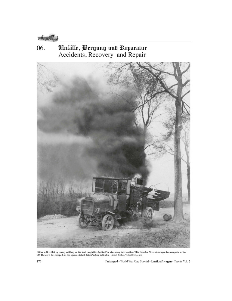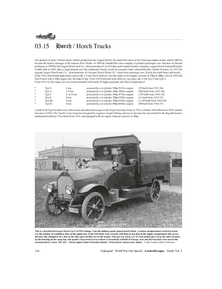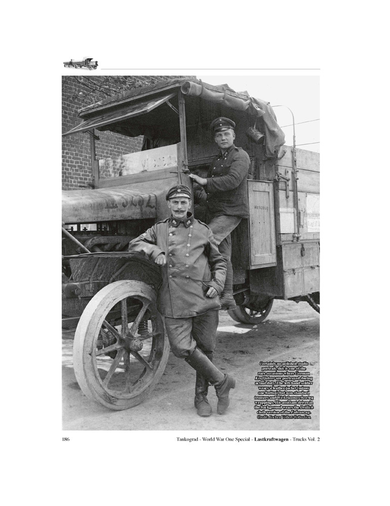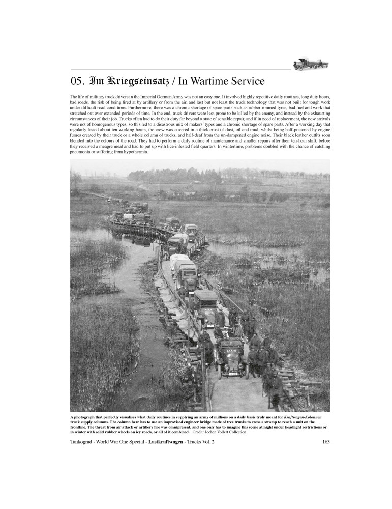 Cette publication raconte, pour la première fois, l'histoire de la façon dont le Lastkraftwagen (camion cargo) est devenu l'épine dorsale des opérations de ravitaillement militaire allemandes pendant la Première Guerre mondiale. La création et l'organisation de la Kraftfahrtruppe (Army Motor Transport Corps) sont largement décrites dans le texte, suivies de chapitres richement illustrés sur les camions des différents fabricants. Ceux-ci incluent des acteurs majeurs tels que Benz, Daimler et Opel ; des légendes de la construction de camions telles que Büssing, Horch, Mannesmann-Mulag et Stoewer - des noms qui aujourd'hui ont tous disparu dans l'histoire ; et aussi des marques énigmatiques telles que Ageka, Komnick et Windhoff, pour n'en citer que quelques-unes. Des chapitres supplémentaires sur le service en temps de guerre, ainsi que sur les uniformes, complètent l'étude de cette première ère de l'automobile militaire allemande dans une exhaustivité jusqu'alors inédite.