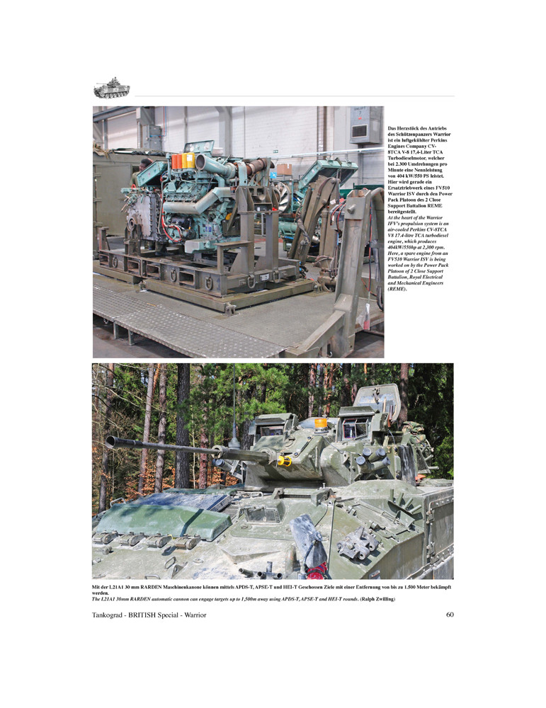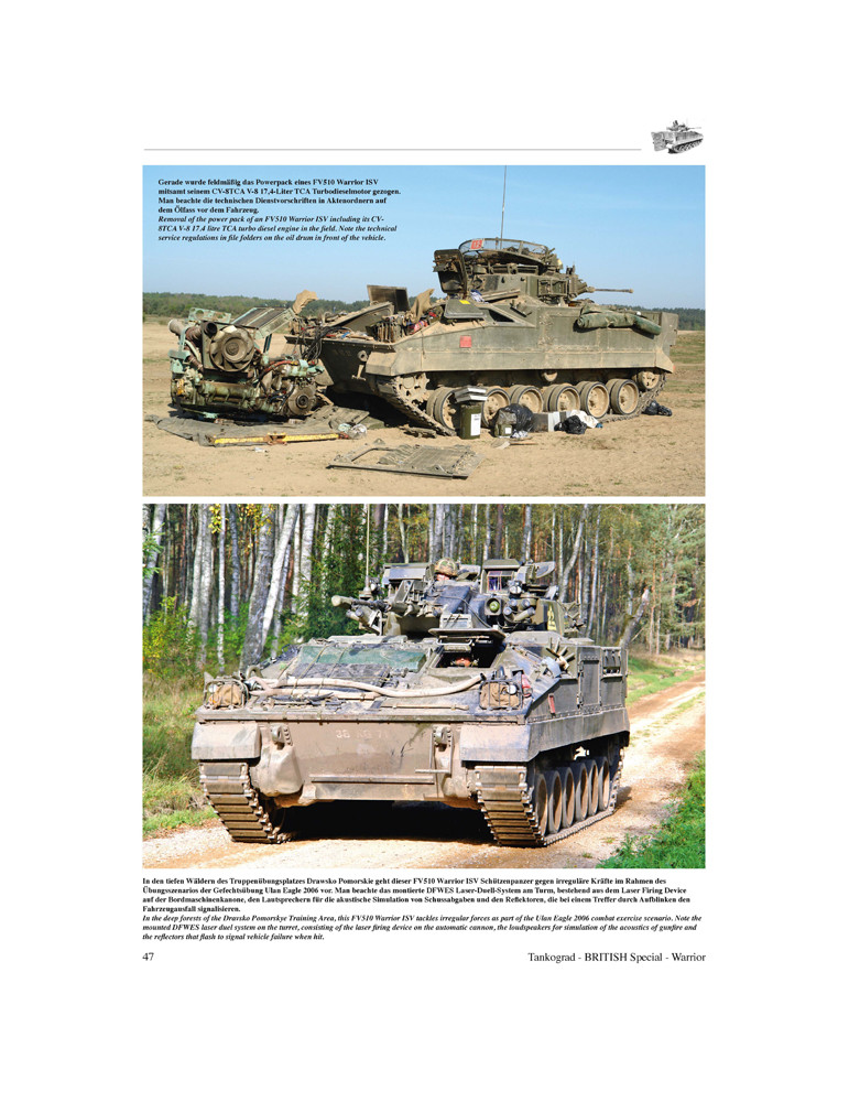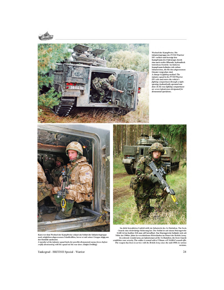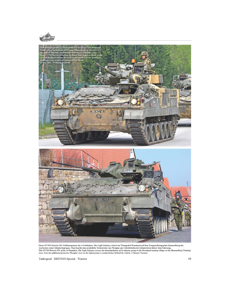 Dès 1967, les premières propositions d'un concept d'exigences pour un nouveau véhicule blindé de combat d'infanterie ont été recueillies au Royaume-Uni. La fin des années 1970 voit le concept prendre forme sous la désignation MCV-80 (Mechanised Combat Vehicle for the 80s) et en 1985 le véhicule reçoit son nom officiel "Warrior". Depuis 1987, le Warrior est l'épine dorsale des unités d'infanterie blindée britannique. Cette publication en double volume, richement illustrée de 250 photos sur un total de 128 pages, décrit le développement, la technologie et le service militaire du Warrior Infantry Section Vehicle (Special 9035) ainsi que les variantes, les opérations et les programmes de mise à niveau de l'ensemble du Warrior. famille de véhicules (Spécial 9036).