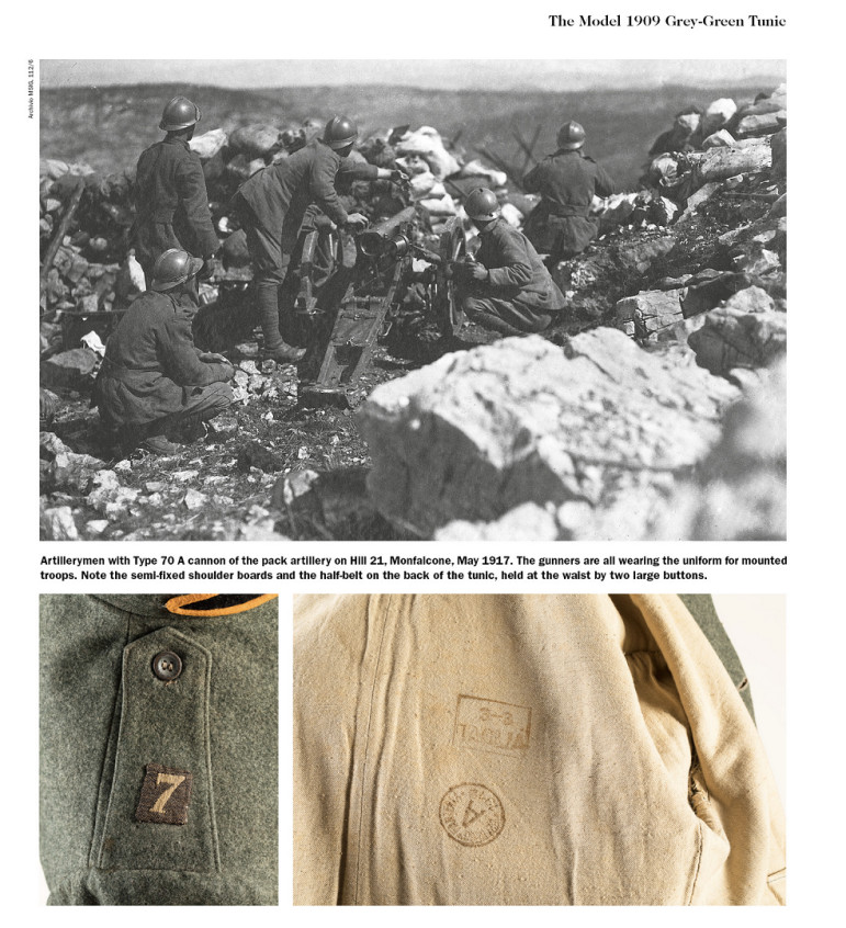 Cet ouvrage richement illustré montre des uniformes, des casquettes et des casques d'acier, couvrant tous les modèles de l'uniforme de campagne de l'armée depuis l'introduction du nouvel uniforme jusqu'à la fin de la guerre. Des photographies contemporaines en noir et blanc montrent comment les vêtements étaient portés en action. En outre, les deux volumes comprennent de nombreuses biographies courtes et des legs de personnalités telles que Luigi Cadorna, Armando Diaz, Gabriele d'Annunzio, Cesare Battisti, Damiano Chiesa, Fabio Filzi, Ettore Lajolo et les frères Calvi, et des formations comme le 87e escadrille aérienne "Serenissima", qui a effectué une mission audacieuse au-dessus de la ville ennemie de Vienne en août 1918.