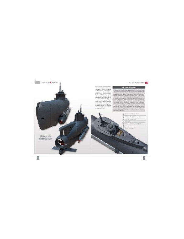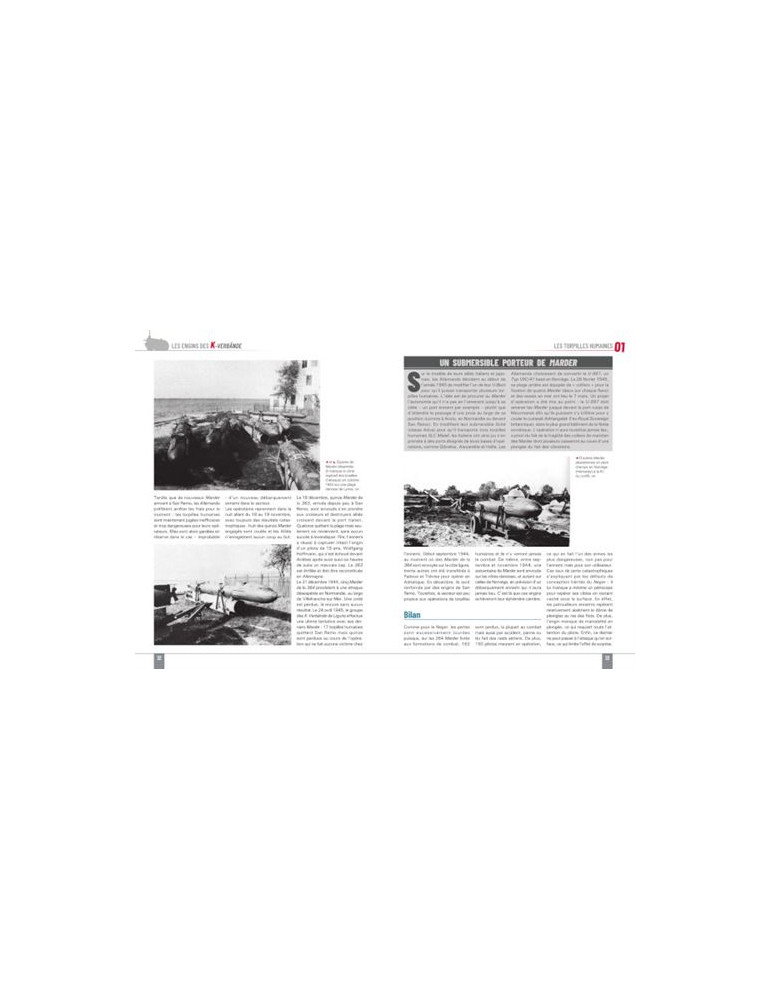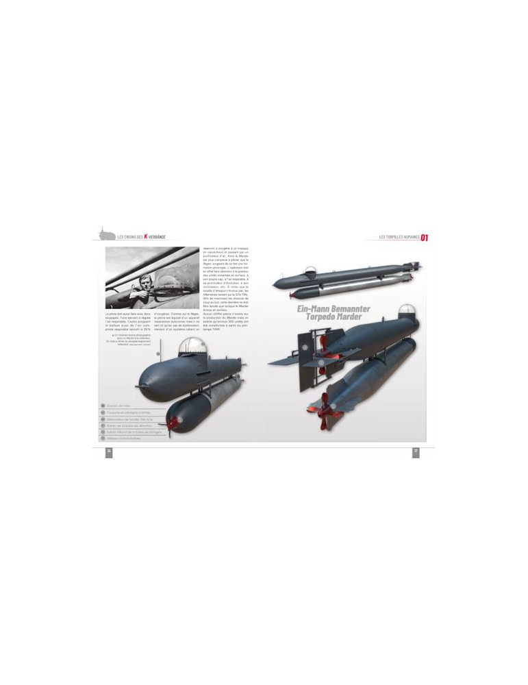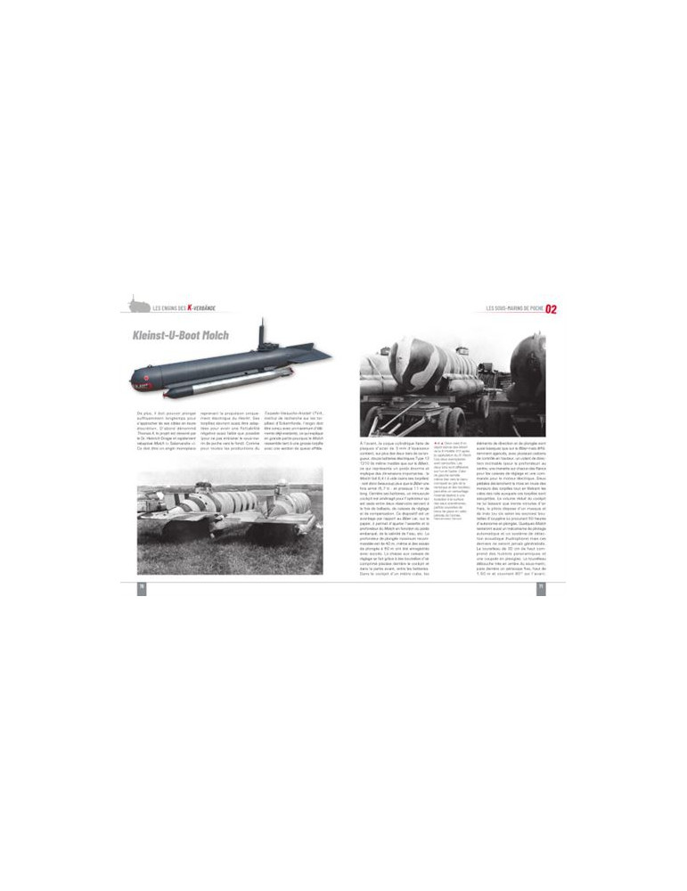 Très complet, cet ouvrage fait une présentation technique de toutes les versions de ces engins conçus, construits et envoyés au combat par l’Allemagne avant la fin de la guerre : torpilles humaines Neger, Marder et Hai, sous-marins de poche Hecht, Biber, Molch et Seehund ainsi que les canots explosifs Linse. Il explique les aléas de leur production et en détaille les opérations et combats. Le tout est accompagné de nombreuses photos d’époque, de vues 3D, de plans, de cartes et de fiches techniques.