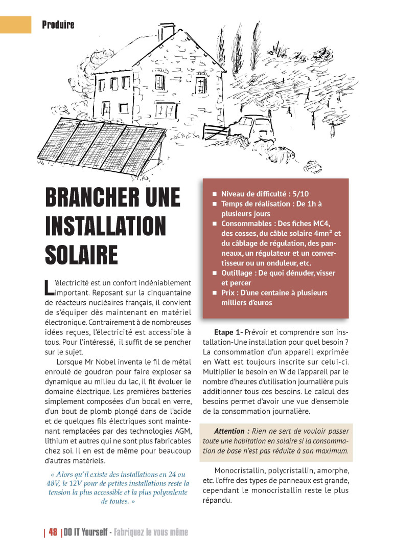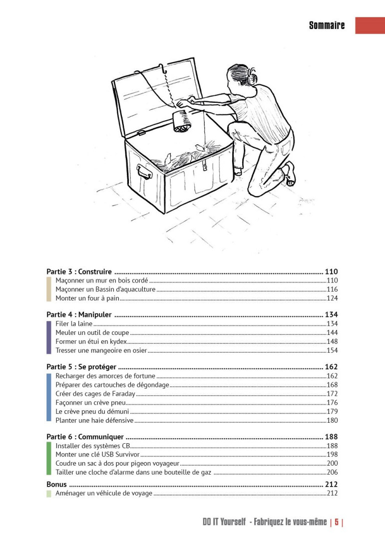 Avec 30 projets classés selon 7 thèmes, ce livre vous apprendra, entre autres, à monter une installation solaire, construire un poulailler mobile, monter un four à pain, planter une haie défensive, installer une CB, tailler une cloche d’alarme dans une bouteille de gaz et bien d’autres.