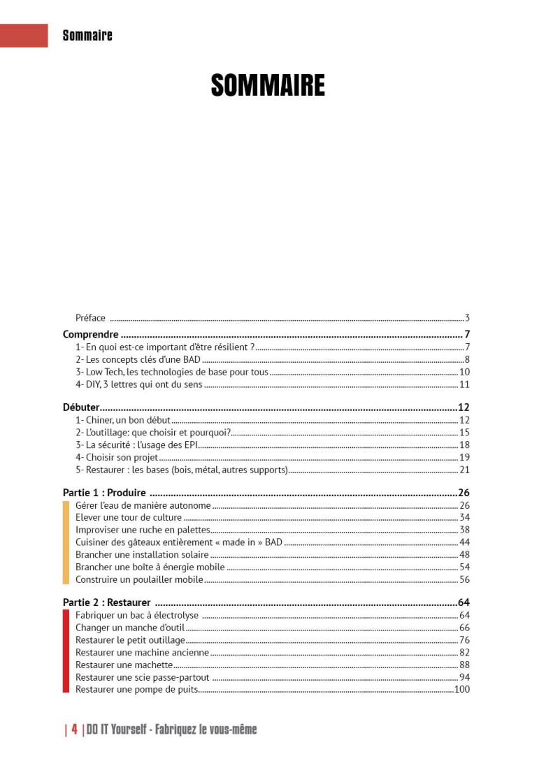 Réflexion, préparation, outillage, méthode, improvisation sont ici abordés avec un seul but : faire soi-même pour gagner en confiance, en autonomie et amorcer de manière proactive le grand tournant qui se profile pour l’humanité : faire plus avec moins.