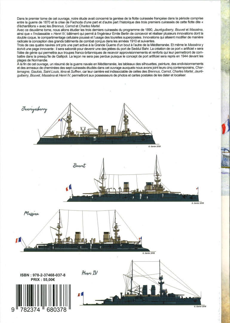 Avec ce deuxième tome, nous allons étudier les trois derniers cuirassés du programme de 1890, Jauréguiberry, Bouvet et Masséna, ainsi que « l’inclassable » Henri IV, bâtiment qui permit à l’ingénieur Emile Bertin de concevoir et réaliser plusieurs innovations dont la double coque, le compartimentage cellulaire poussé et l’usage des tourelles superposées. Innovations qui allaient modifier de manière radicale la conception des grands bâtiments de combat conçus dans les années 1910 et suivantes.