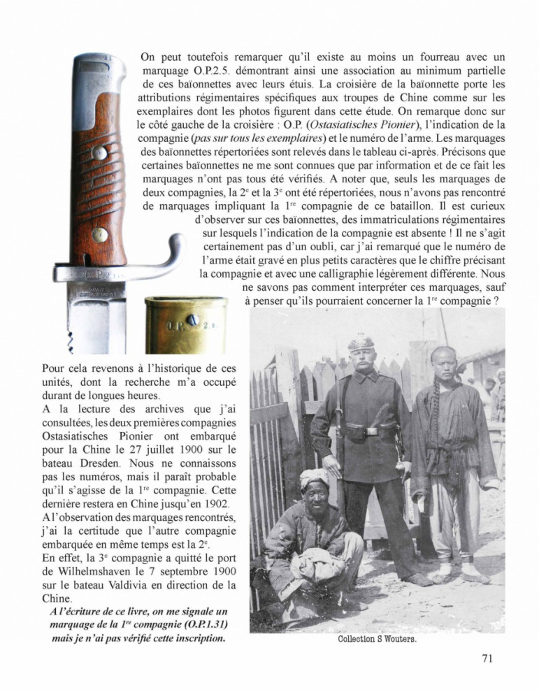 Les porte-baïonnettes et une liste de marquages régimentaires permettront aux collectionneurs d’identifier leurs baïonnettes et autres équipements. Plusieurs pages sont consacrées aux copies de plus en plus nombreuses et de mieux en mieux réalisées. Enfin, un additif d’informations sur les baïonnettes ersatz et une planche couleur de troddeln complètent cet ouvrage.
