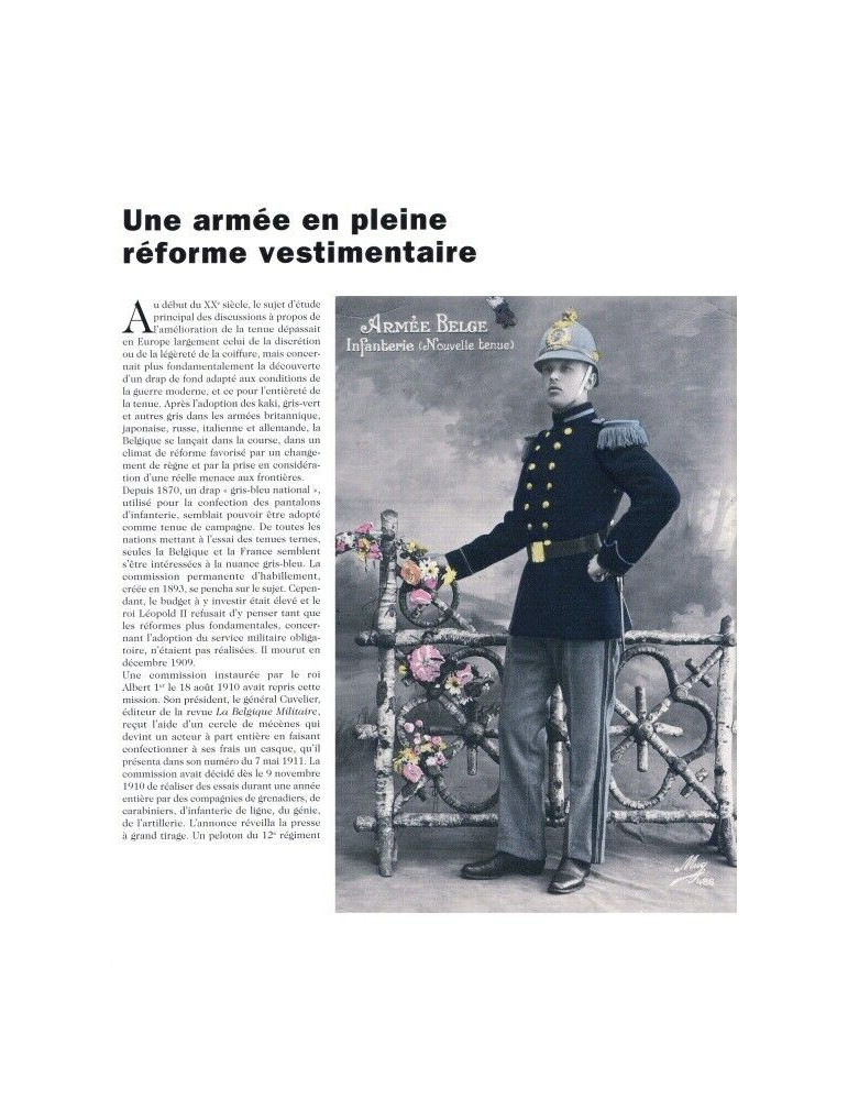 Ce travail est inédit par son ampleur et peut donc prétendre servir de référence. Il s'appuie sur les immenses collections du Musée royal de l'Armée et d'Histoire militaire de Belgique, complétées par des collections particulières, de manière à illustrer le plus grand nombre possible d'objets. Comme beaucoup d'armées de petits états, celle du royaume de Belgique marie en 1914 les influences des grandes puissances, s'inspirant tantôt de la France (uniformes), tantôt de l'Allemagne (équipements).