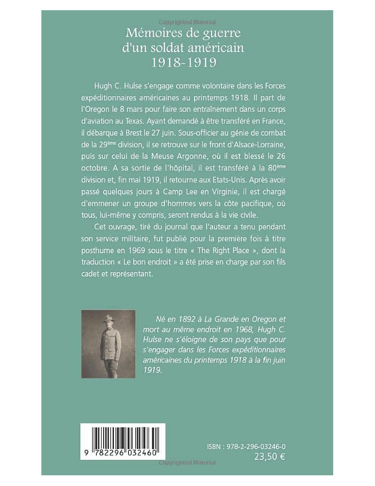 Hugh C. Hulse s'engage comme volontaire dans les Forces expéditionnaires américaines au printemps 1918. Ayant demandé à être transféré en France, il débarque à Brest en juin. Sous-officier au génie de combat de la 29ème division, il se retrouve sur le front d'Alsace-Lorraine, puis sur celui de la Meuse Argonne, où il est blessé le 26 octobre. A sa sortie de l'hôpital, il est transféré à la 80ème division et, fin mai 1919, il retourne aux Etats Unis.