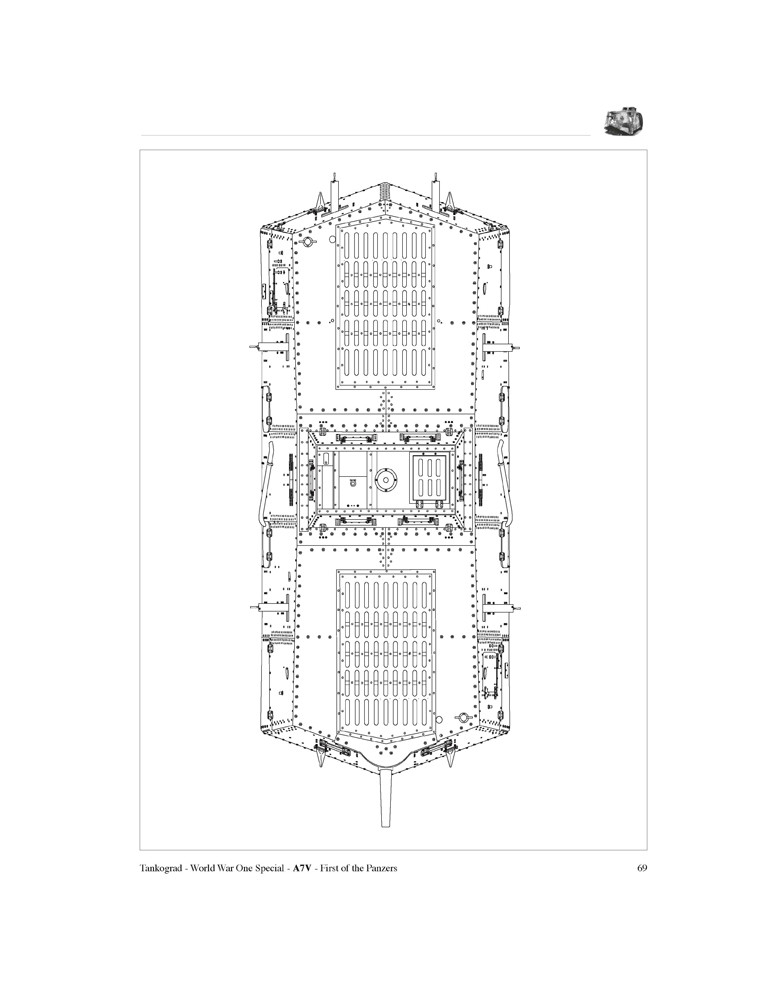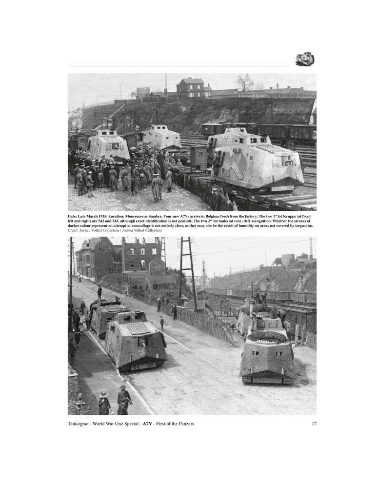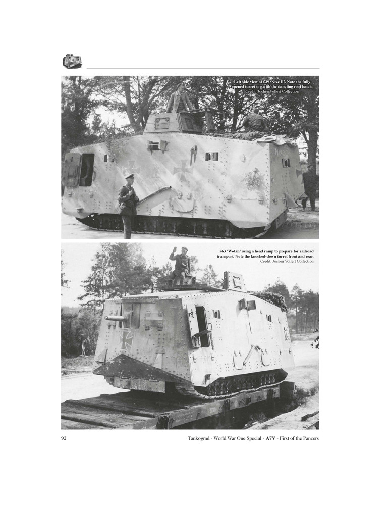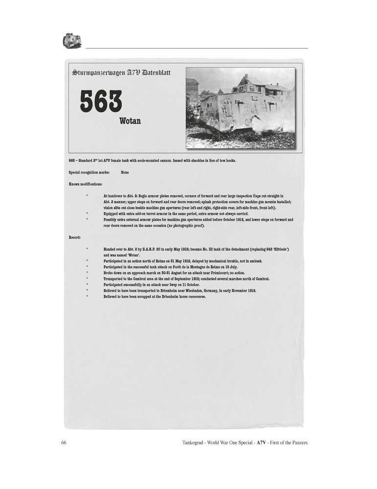 Il met également en évidence le char sous un angle différent, y compris des fiches techniques individuelles avec des enregistrements pour chaque A7V jamais construit, l'utilisation en temps de guerre dans les trois Abteilungen et les variantes utilisés par les Freikorps.