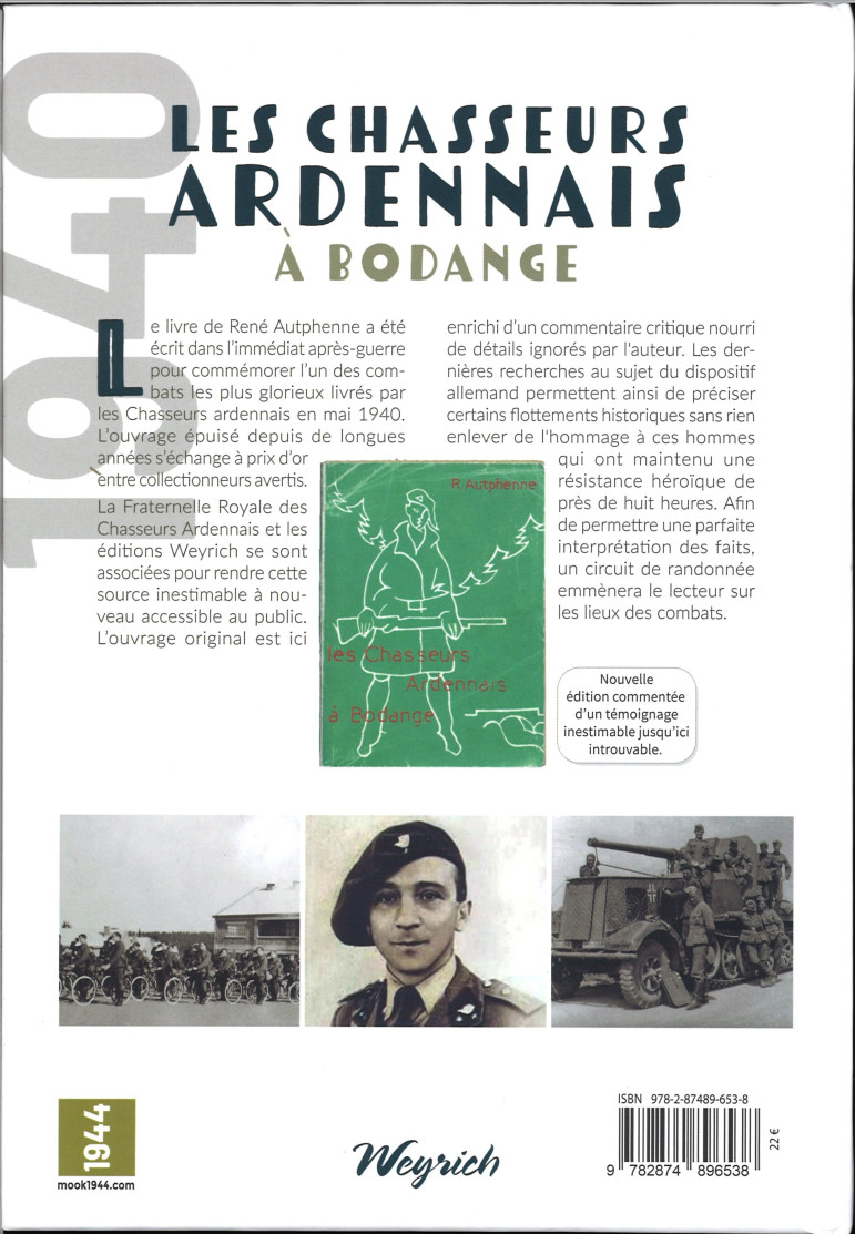 Le 10 mai, 17 Chasseurs ardennais perdent la vie en défendant le point d’appui de Bodange contre l’invasion allemande. Sollicité par ses camarades, le Commandant René Autphenne a pris la plume pour rendre hommages aux hommes tombés. Outre ses propres souvenirs, il y a joint les témoignages de plusieurs acteurs, tant soldats que sous-officiers, ayant combattu dans les différents groupes, grâce aux documents disponibles à l’époque.