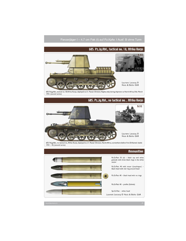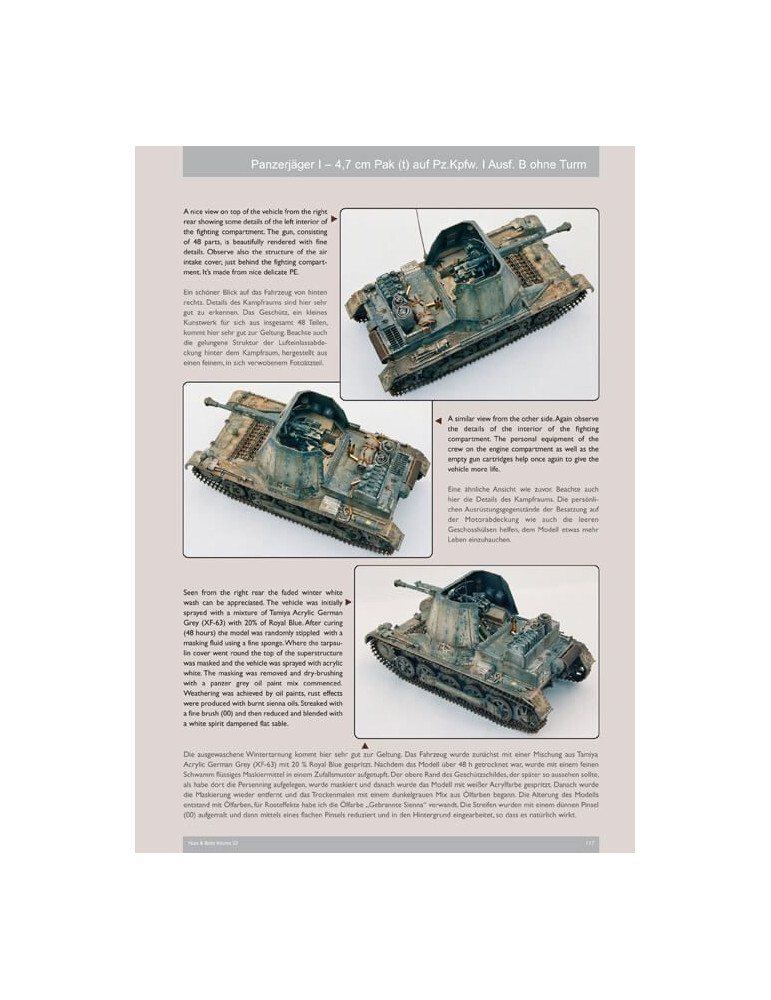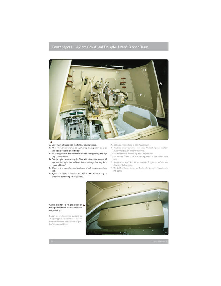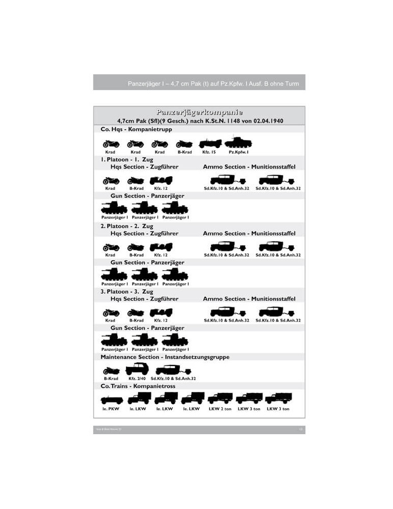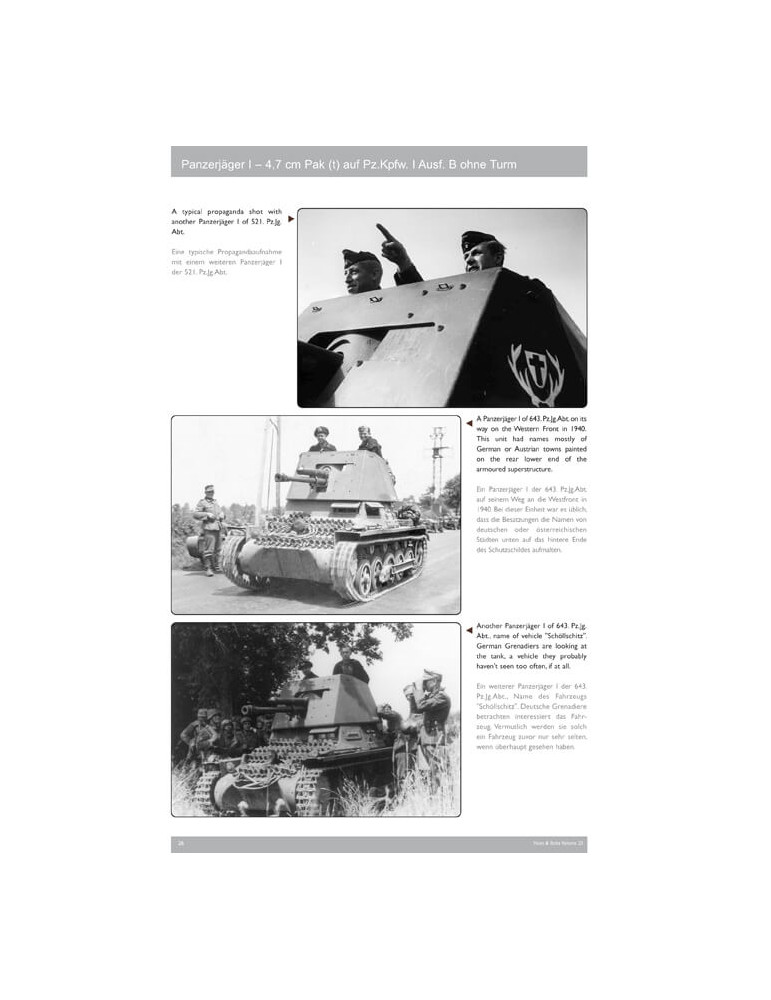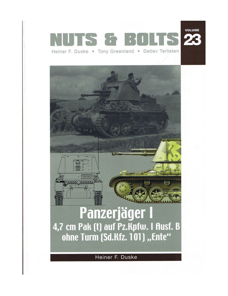 Ce volume 23 contient 224 photos, dont 109 clichés historiques du véhicule automoteur avec toutes les variantes connues et du canon PaK remorqué en n/b, dont beaucoup inédits ; 98 photos couleur de l'exemple existant du Sd.Kfz. 101 du seul véhicule survivant au Wehrtechnische Studiensammlung à Koblenz et deux canons remorqués survivants, 17 photos couleur des deux versions de Tony Greenland, légendes anglais / allemand, 22 pages de texte anglais / allemand, 8 pages de dessins de toutes les versions et remorquées canon à l'échelle 1:35 de John Rue, 24 schémas de camouflage et graphismes de marquages tactiques de Laurent Lecocq, et un tableau d'organisation des unités utilisant le Pz.Jäger I (Kriegstärke-Nachweisungen KStN), révisé et agrandi (plus du double de taille) de l'édition du Vol.07.