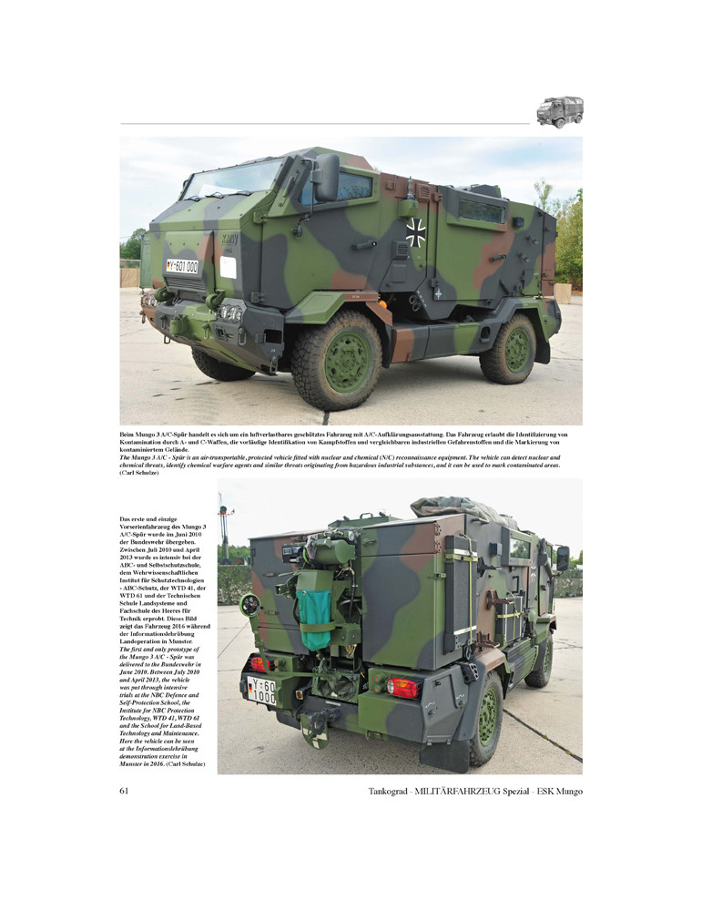 Dans un avenir proche, le véhicule de reconnaissance nucléaire/chimique (N/C) Mungo 3 A/C-Spür entrera également en service dans la Bundeswehr. Cette publication décrit toutes les variantes de Mungo pour la toute première fois et de manière très détaillée.