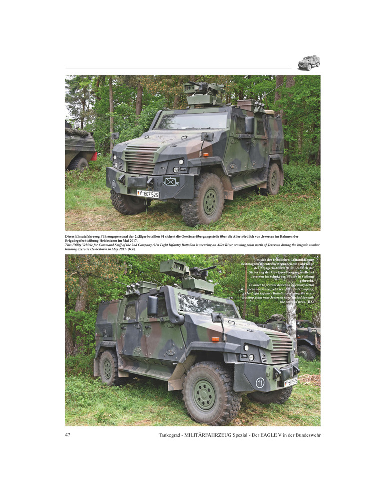 Dans le cas du nouveau véhicule utilitaire protégé Eagle V pour l'état-major, le développement était principalement axé sur l'augmentation de la charge utile, une meilleure protection de toutes les zones, une meilleure mobilité, une similitude logistique avec l'Eagle IV déjà déployé et une disponibilité rapide. Depuis la remise du premier véhicule de série à l'armée allemande le 4 avril 2014, 176 véhicules ont été achetés par la Bundeswehr.