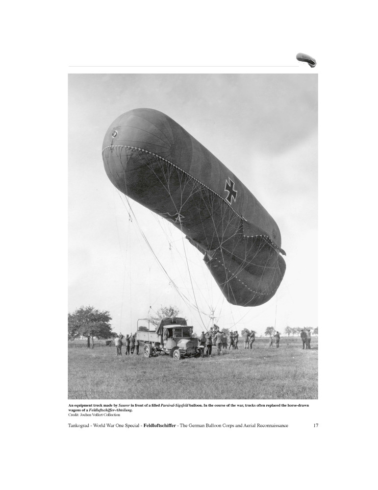 Le Feldluftschiffer, ou Feldluftschiffertruppe (corps de ballons) a fourni une reconnaissance étendue et souvent décisive des mouvements de troupes ennemies et des positions d'artillerie, et a guidé les tirs d'artillerie et les attaques d'infanterie des forces allemandes. Le corps de ballon lui-même était une arme du 19ème siècle qui devait jouer son rôle le plus important dans la guerre de 1914-18. Jamais avant et jamais après il n'aurait atteint une telle renommée. Sans le corps de ballons et d'autres moyens de reconnaissance aérienne, l'armée impériale allemande aurait été aveugle.