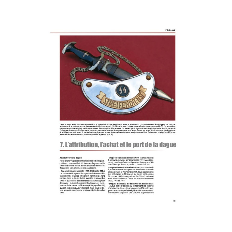Après le succès de L’Ordre noir, Allgemeine-SS 1925-1945, encyclopédie illustrée dédiée au projet de « société totale » qu’envisageait la SS, nous avons souhaité approfondir encore le sujet par ce nouveau volume. Jean-François Pelletier et Georges Bernage ont rédigé respectivement une partie de cet ouvrage. L’une présente une étude détaillée des armes blanches de l’Ordre, accompagnée d’une iconographie, riche et inédite. L’autre, sous forme de dictionnaire illustré, compile documents et lecture critique de la dimension « culturelle » et symbolique des grandes caractéristiques de l’Ordre noir.