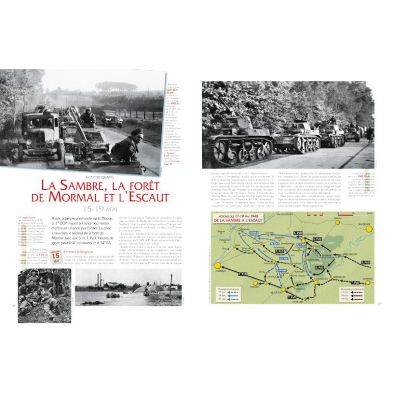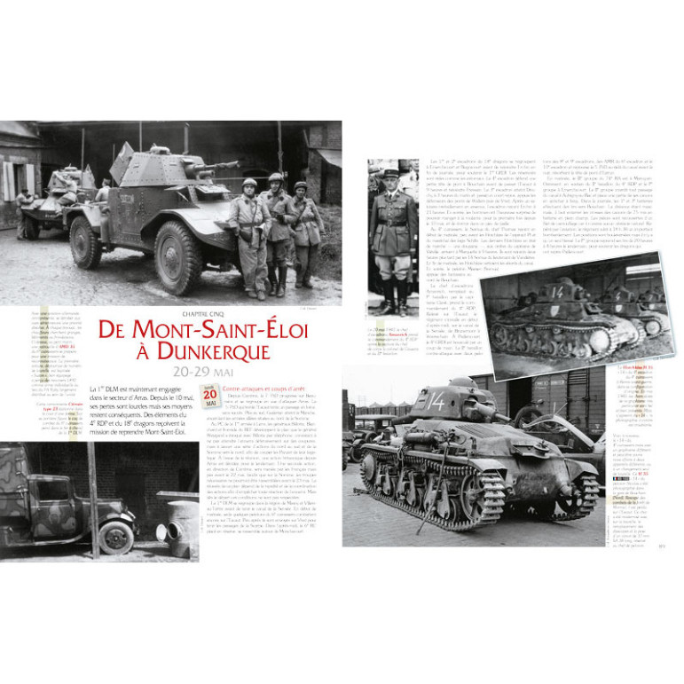 C’est l’histoire de la première de ces grandes unités françaises d’un type nouveau que ce beau livre raconte. Une histoire faite de vitesse, de fureur, d’essence, de poudre et de sang. À l’aube du 10 mai 1940, la 1re division légère mécanique — la 1re DLM — s’élance sur son objectif : rejoindre le plus vite possible les Pays-Bas, en pointe de l’armée Giraud, dans le cadre du trop ambitieux plan allié visant à la jonction de l’ensemble des forces occidentales face au déferlement hitlérien. Ce plan échouera hélas, mais les hommes de la 1re DLM connaîtront leurs plus belles heures au cours de ces semaines de ruées et contre ruées mécaniques qui les conduiront à travers les plaines de Belgique et des Flandres, dans la bataille de la forêt de Mormal puis, à front renversé, à la reprise de haute lutte de Mont-Saint-Éloi.
