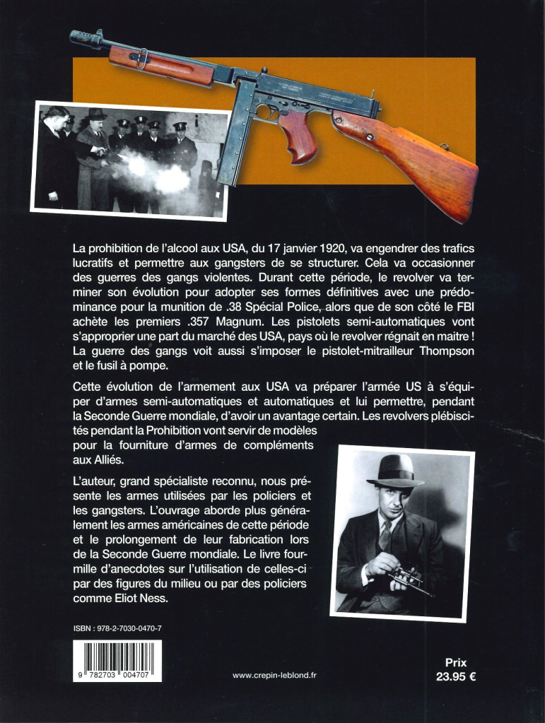 L'auteur, grand spécialiste reconnu, nous présente les armes utilisées par les policiers et les gangsters. L'ouvrage aborde plus généralement les armes américaines de cette période et le prolongement de leur fabrication lors de la Seconde Guerre mondiale. Le livre fourmille d'anecdotes sur l'utilisation de celles-ci par des figures du milieu ou par des policiers comme Eliot Ness.