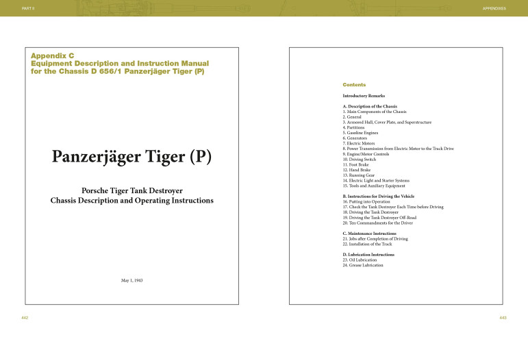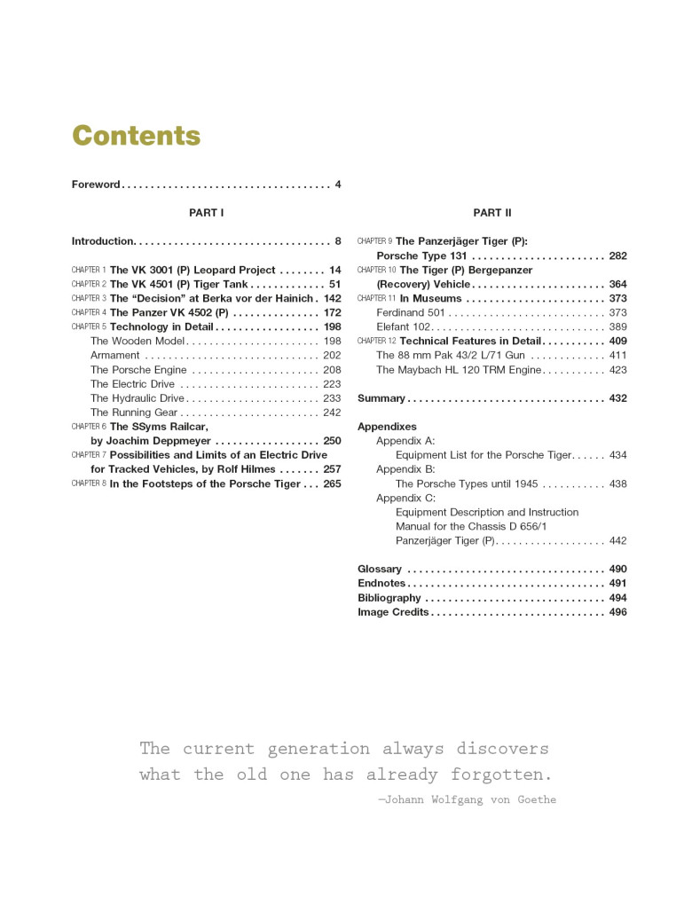 Ce travail fait suite au livre de l'auteur Michael Fröhlich sur l'énorme char "Maus" de Porsche et décrit les autres conceptions de véhicules blindés de l'entreprise, avec un accent particulier sur le prototype VK 4501 (P) Tiger et le chasseur de chars "Ferdinand". VK 4501 était la désignation des prototypes en compétition pour être ce qui allait devenir le Panzer VI "Tiger".