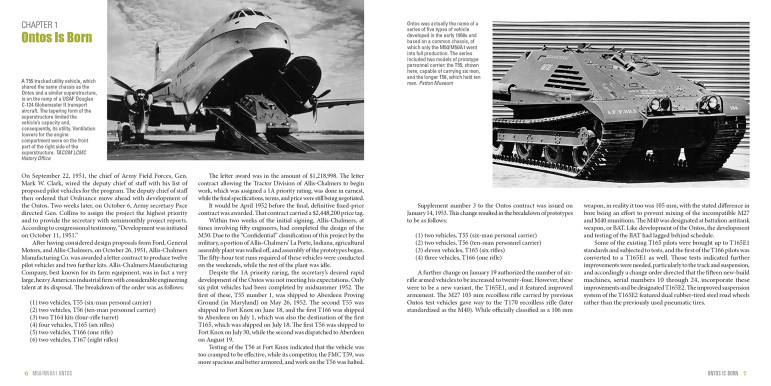 Conçu pour contrer la menace d'un assaut blindé soviétique massif, le M50 Ontos a montré son mérite dans les jungles et les villes du Vietnam. Ontos est né du projet Vista, l'étude secrète d'améliorations possibles des défenses de l'OTAN. Le projet Vista a identifié le besoin d'un "quelque chose" peu coûteux et lourdement armé pour contrecarrer les vagues d'armures soviétiques. Armé de six puissants canons sans recul, le petit M50 a reçu le nom de "Ontos", une traduction erronée du grec par l'armée pour "la chose".
