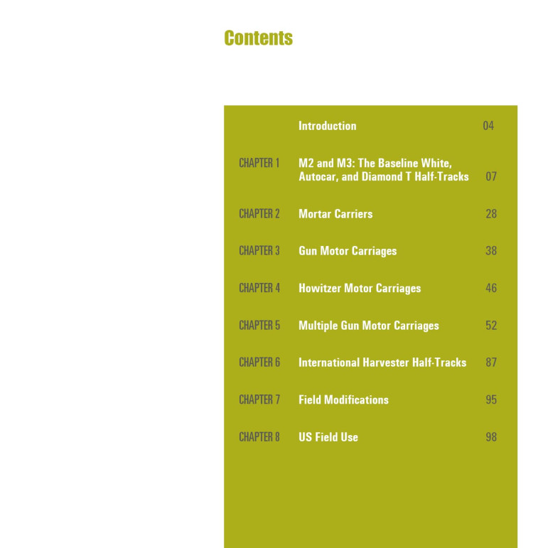 Ce volume comprend la couverture des véhicules produits par Autocar, Diamond T et White destinés à être utilisés par les forces américaines, ainsi que les véhicules similaires construits par International Harvester fournis aux alliés par le biais du prêt-bail. Illustré de plus de 200 photos d'époque, ainsi que de dessins au trait et de profils de couleurs.