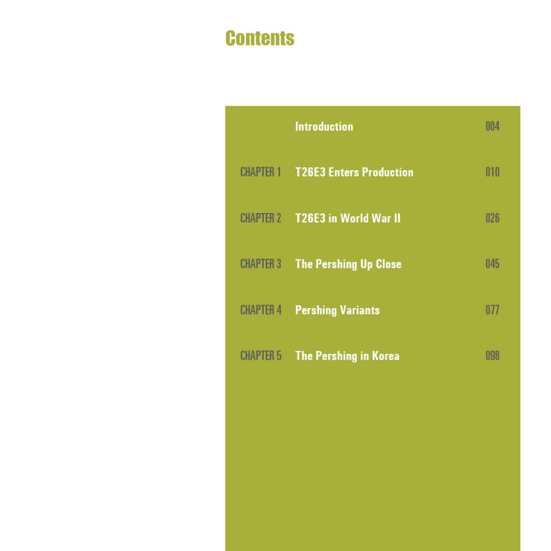Cette histoire illustrée du Pershing comprend les M26/T26E3, T26E1, T26E4 et T26E2/M45. Le livre comprend près de 300 photographies anciennes et récentes, des profils de couleurs et des dessins au trait détaillés.