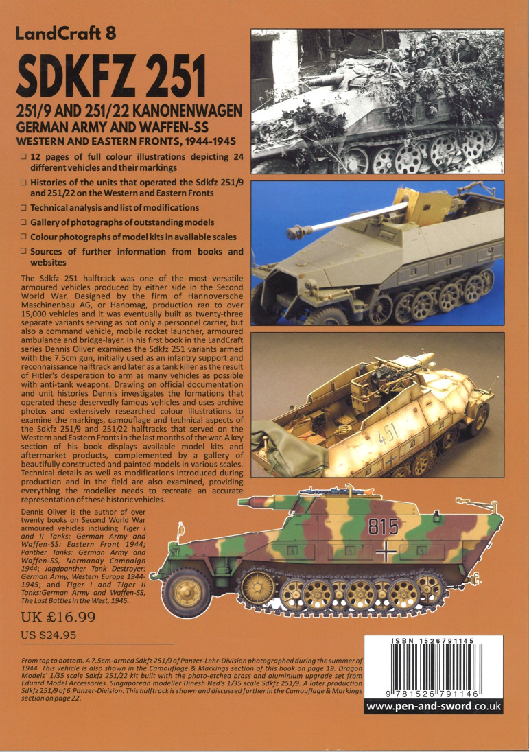 Dans son premier livre de la série LandCraft, Dennis Oliver examine les variantes Sdkfz 251 armées du canon de 7,5 cm, initialement utilisées comme semi-chenillé de soutien et de reconnaissance d'infanterie et plus tard comme chasseur de chars à la suite de la volonté d'Hitler d'armer autant de véhicules que possible. avec des armes antichars.