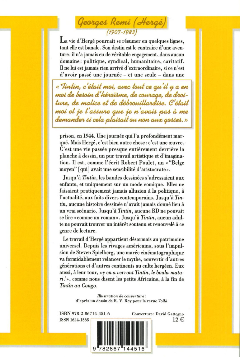 La vie d'Hergé pourrait se résumer en quelques lignes, tant elle est banale. Son destin est le contraire d'une aventure : il n'a jamais eu de véritable engagement, dans aucun domaine : politique, syndical, humanitaire, caritatif. Il ne lui est jamais rien arrivé d'extraordinaire, si ce n'est d'avoir passé une journée - et une seule - dans une prison, en 1944. Une journée qui l'a profondément marqué. Mais Hergé, c'est bien autre chose : c'est une œuvre. C'est une vie passée presque entièrement derrière la planche à dessin, un pur travail artistique et d'imagination. Il est, comme l'écrit Robert Poulet, un "Belge moyen" [qui] avait une sensibilité d'aristocrate.