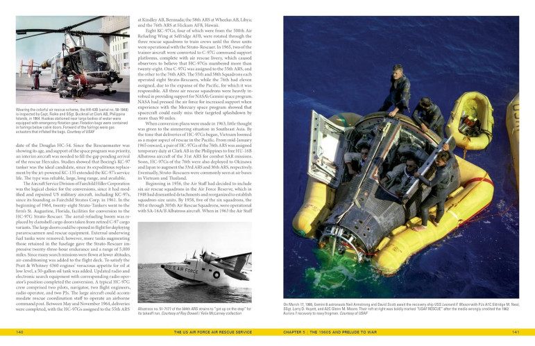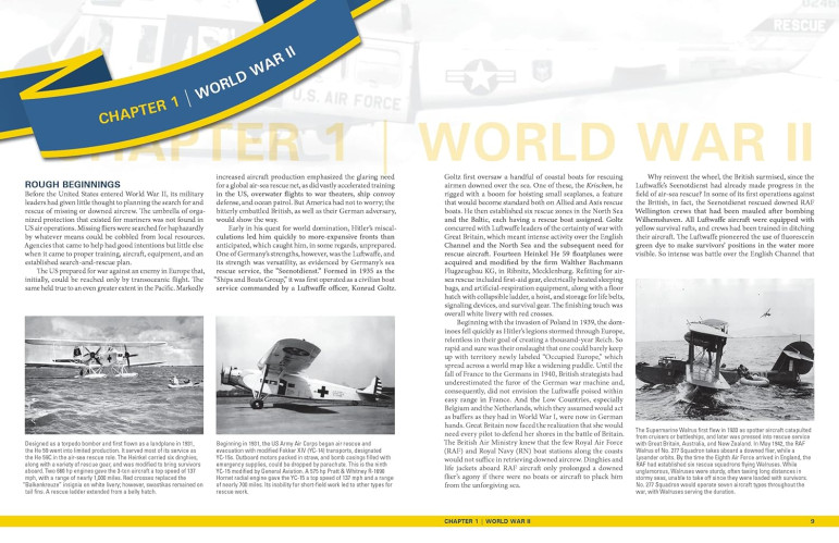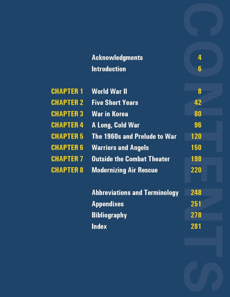 Un texte détaillé, accompagné de nombreuses photos, dont beaucoup n'ont jamais été publiées auparavant, présente tous les aspects des opérations de sauvetage aérien, depuis la création du service, la formation et l'équipement spécialisés, et des descriptions des types d'avions aussi variés que le Stinson L-5, le Douglas SC-47, Douglas HC/SC-54D « Rescuemaster », Fairchild SC-82A « Packet », Boeing HC-97G « Strato-Rescuer », Bell H-1 « Huey », Sikorsky H-3 « Jolly Green Giant » et bien d'autres.