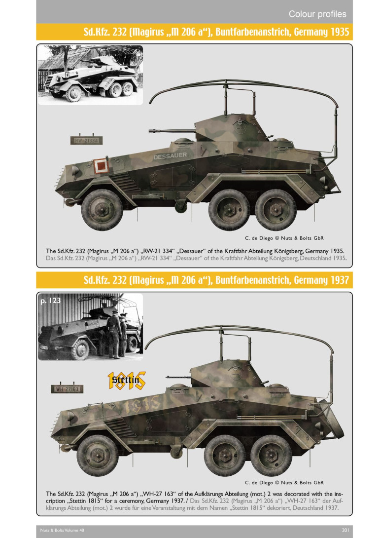 En raison du petit nombre de véhicules, la recherche de matériel s'est avérée très difficile. Mais après douze années de recherches intensives et avec l'aide d'innombrables amis, la collection s'est de plus en plus agrandie et nous sommes heureux de pouvoir annoncer le numéro 48 de notre série pour fin octobre 2023. Les véhicules blindés de reconnaissance à six roues Sd .kfz. 231, 232 et 263 de Büssing, Daimler-Benz et Magirus.