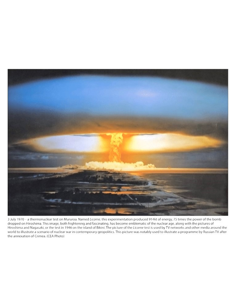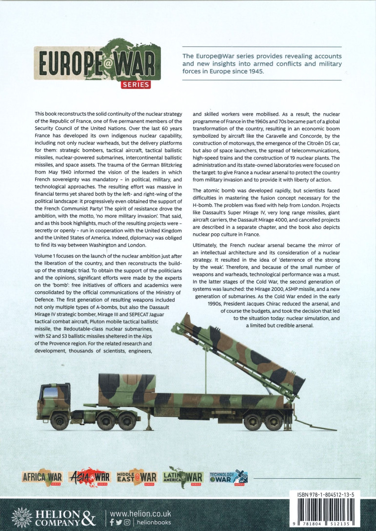 La bombe atomique a été développée rapidement, mais il a été difficile de maîtriser le concept de fusion nécessaire à la bombe H. Le problème a été résolu avec l’aide de Londres. Des projets comme le Super Mirage IV de Dassault, les missiles à très longue portée, les porte-avions géants, le Dassault Mirage 4000 et les projets annulés sont décrits dans un chapitre séparé, et le livre dépeint également la culture pop nucléaire en France. En fin de compte, l’arsenal nucléaire français est devenu le miroir d’une architecture intellectuelle et de sa réflexion sur une stratégie nucléaire. Il en est résulté l’idée de « dissuasion du fort par le faible ». Par conséquent, et en raison du petit nombre d’armes et d’ogives nucléaires, la performance technologique était indispensable.