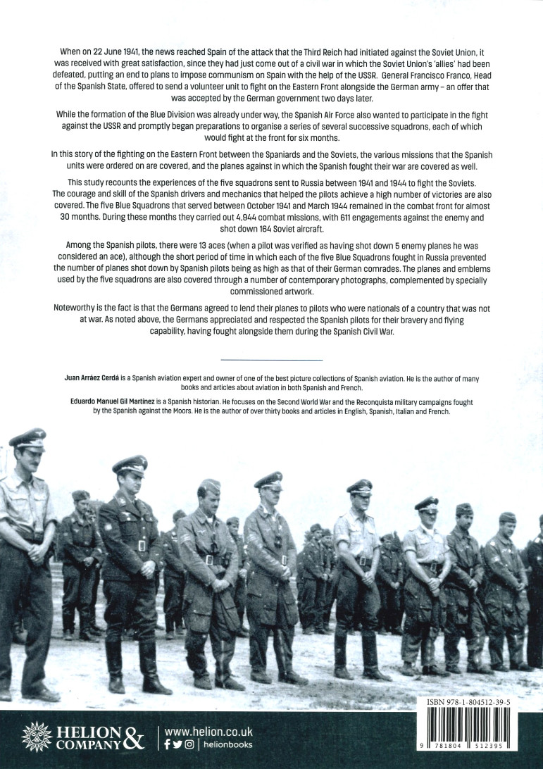 Dans cette histoire des combats sur le front de l'Est entre les Espagnols et les Soviétiques, les différentes missions pour lesquelles les unités espagnoles ont reçu des ordres sont couvertes, ainsi que les avions contre lesquels les Espagnols ont mené leur guerre. Cette étude retrace les expériences des cinq escadrons envoyés en Russie entre 1941 et 1944 pour combattre les Soviétiques. Le courage et l'habileté des pilotes et mécaniciens espagnols qui ont aidé à remporter un grand nombre de victoires sont également abordés. Les cinq escadrons Azul qui servirent entre octobre 1941 et mars 1944 restèrent sur le front de combat pendant près de 30 mois. Au cours de ces mois, ils ont effectué 4944 missions de combat, avec 611 engagements contre l'ennemi et abattu 164 avions soviétiques.