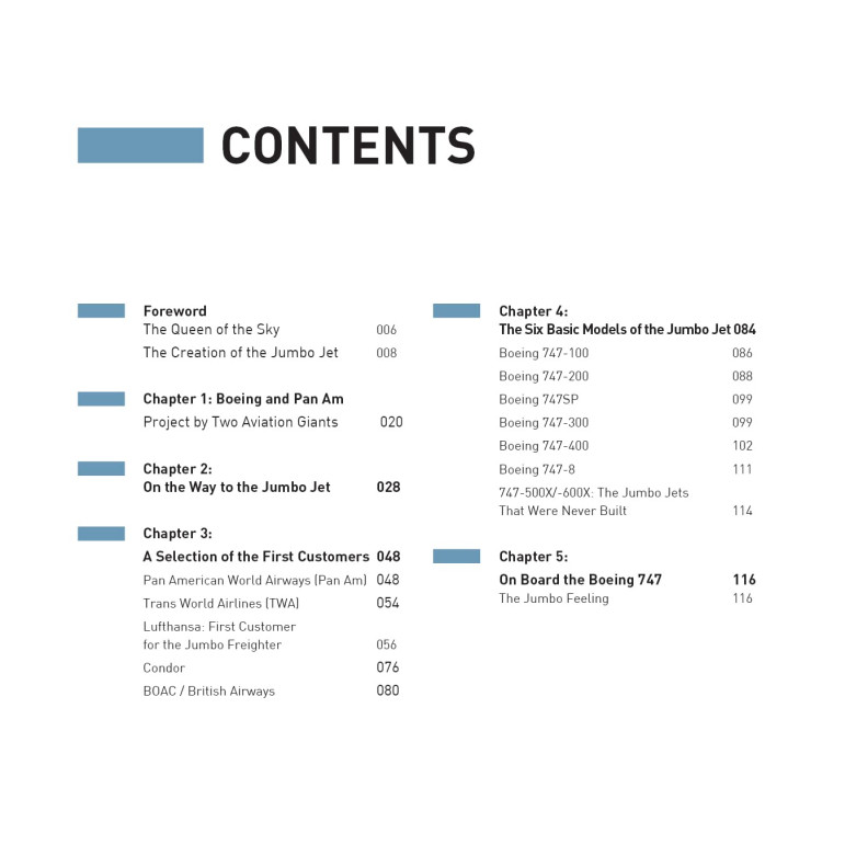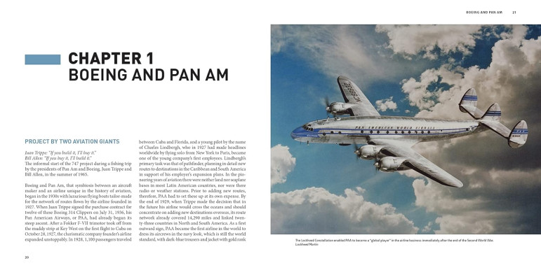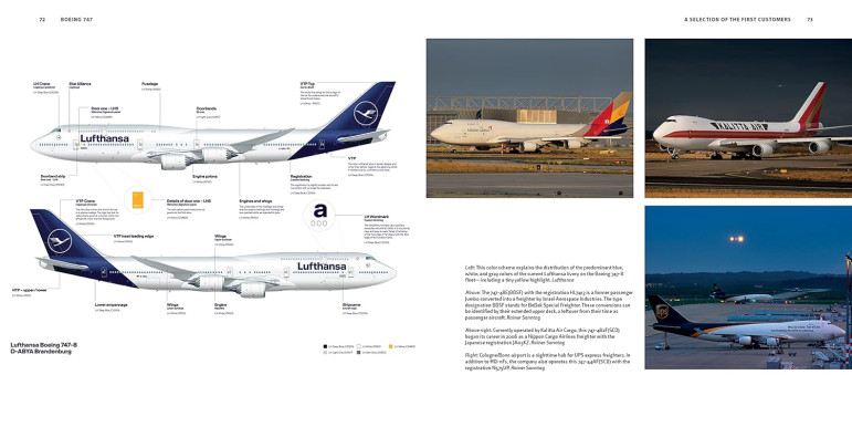 L'histoire de la conception, du développement et de l'utilisation opérationnelle du 747 est présentée en détail dans ce livre, tout comme son utilisation. par plusieurs des compagnies aériennes les plus célèbres au monde, notamment TWA, Pan Am, Lufthansa, Qantas, British Airways, El Al, Air France et près de 100 autres au cours de sa longue carrière. Des gouvernements et des militaires du monde entier ont également piloté le 747, pour des missions telles que le transport de l'ancienne flotte de navettes spatiales de la NASA et de l'actuel avion présidentiel de l'US Air Force One. Les spécifications techniques du 747 et de ses variantes, ainsi que des photographies d’époque, font revivre l’histoire fascinante de l’un des avions les plus emblématiques de Boeing.