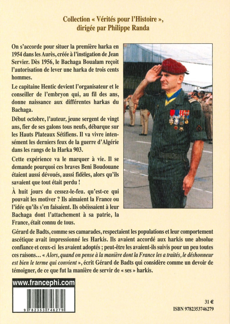 Début octobre, l’auteur, jeune sergent de vingt ans, fier de ses galons tous neufs, débarque sur les Hauts Plateaux Sétifiens. Il va vivre intensément les derniers feux de la guerre d’Algérie dans les rangs de la Harka 903. Cette expérience va le marquer à vie. Il se demande pourquoi ces braves Beni Boudouane étaient aussi dévoués, aussi fidèles, alors qu’ils savaient que tout était perdu ! À huit jours du cessez-le-feu, qu’est-ce qui pouvait les motiver ? Ils aimaient la France ou l’idée qu’ils s’en faisaient. Ils obéissaient à leur Bachaga dont l’attachement à sa patrie, la France, était connu de tous.
