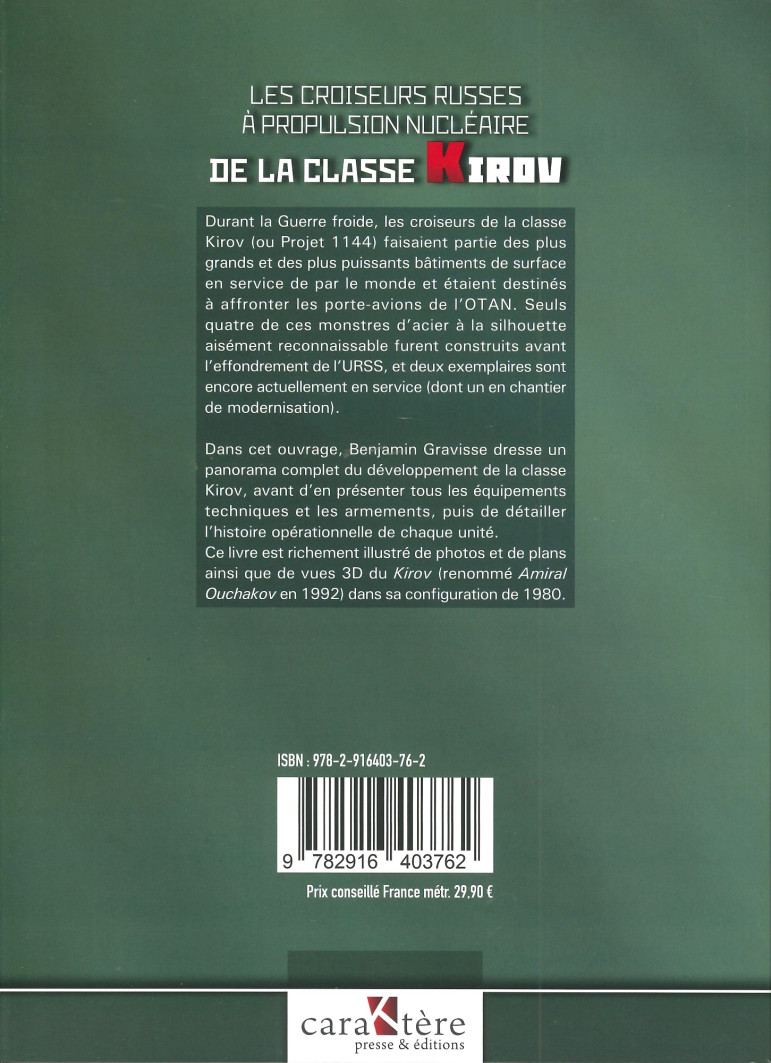 Après un premier ouvrage sur les croiseurs russes de la classe Slava paru au printemps, Benjamin Gravisse, animateur du blog redsamovar.com et expert reconnu des équipements militaires soviétiques et russes, s’attèle à « encore plus gros » ! Durant la Guerre froide, les croiseurs de la classe Kirov (ou Projet 1144) faisaient partie des plus grands et des plus puissants bâtiments de surface en service de par le monde et étaient destinés à affronter les porte-avions de l’OTAN. Seuls quatre de ces monstres d’acier à la silhouette aisément reconnaissable furent construits avant l’effondrement de l’URSS, et deux exemplaires sont encore actuellement en service (dont un en chantier de modernisation).