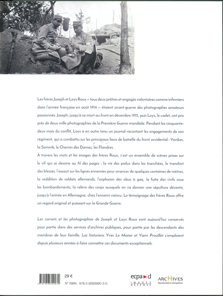 Cet ouvrage a été réalisé à partir du fonds d’archives de Joseph et Loys Roux, prêtres et infirmiers pendant la Première Guerre mondiale. Il rassemble près de 2 000 pages de carnets de guerre tenus quotidiennement par Loys Roux, sans interruption d’août 1914 à décembre 1918, et plus de 1 500 photos, réalisées par Joseph jusqu’à sa mort au front en décembre 1915, puis par Loys jusqu’à la fin de la guerre.