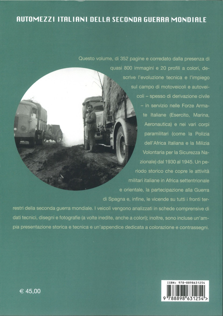 Ce volume, de 352 pages de plus de 800 images n&b et couleur avec de nombreux dessins techniques et 8 pages de profils couleur, est le résultat d'une recherche méticuleuse menée par les auteurs dans la documentation des entreprises productrices et dans de nombreuses archives italiennes et étrangères. Il raconte l'évolution technique et l'utilisation dans le domaine des motocyclettes et des véhicules à moteur - souvent d'origine civile - en service dans les forces armées italiennes et dans les différents corps paramilitaires (comme la Police africaine italienne et la Milice volontaire pour la sécurité nationale) de 1930 à 1945. Une période historique qui couvre les activités militaires italiennes en Afrique du Nord et de l'Est, la participation « officieuse » à la guerre d'Espagne et, enfin, les événements sur tous les fronts terrestres de la Seconde Guerre mondiale.