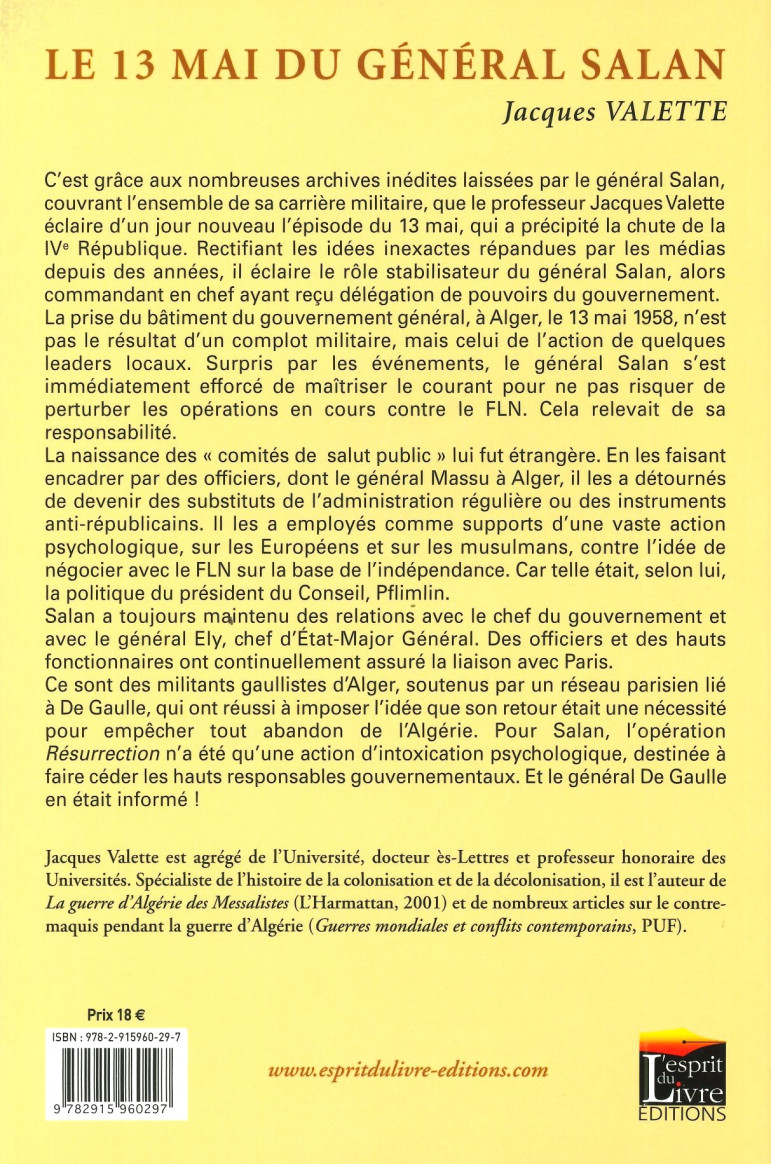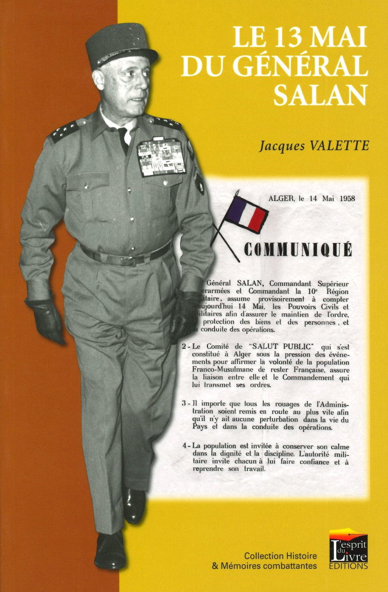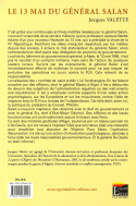 C'est grâce aux nombreuses archives inédites laissées par le général Salan, couvrant l'ensemble de sa carrière militaire, que le professeur Jacques Valette éclaire d'un jour nouveau l'épisode du 13 mai, qui a précipité la chute de la IVe République. Rectifiant les idées inexactes répandues par les médias depuis des années, il éclaire le rôle stabilisateur du général Salan, alors commandant en chef ayant reçu délégation de pouvoirs du gouvernement. La prise du bâtiment du gouvernement général, à Alger, le 13 mai 1958, n'est pas le résultat d'un complot militaire, mais celui de l'action de quelques leaders locaux. Surpris par les événements, le général Salan s'est immédiatement efforcé de maîtriser le courant pour ne pas risquer de perturber les opérations en cours contre le FLN. Cela relevait de sa responsabilité.