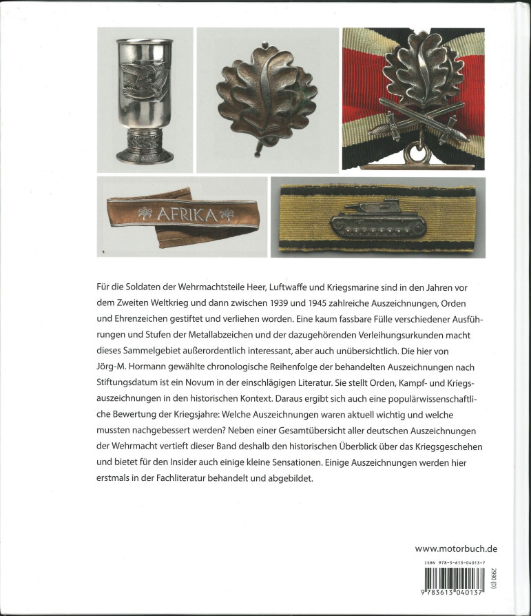 De nombreuses récompenses, médailles et décorations ont été décernées au sein de la Wehrmacht entre 1935 et 1945. L'abondance ingérable et les différentes conceptions rendent ce type de collection extrêmement intéressant. L'ordre des récompenses exposé dans ce livre est celui de Jörg-M. Hormann strictement chronologiquement selon la date de fondation. Il en résulte une évaluation scientifique populaire de la guerre : quelles récompenses étaient actuellement importantes et lesquelles devaient être améliorées ? En plus d'un aperçu général de toutes les récompenses allemandes importantes, ce volume approfondit l'aperçu historique de la guerre.